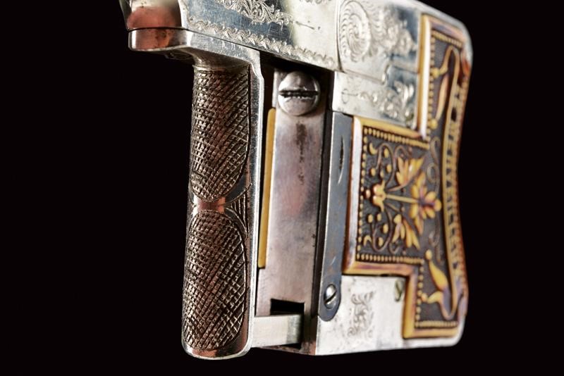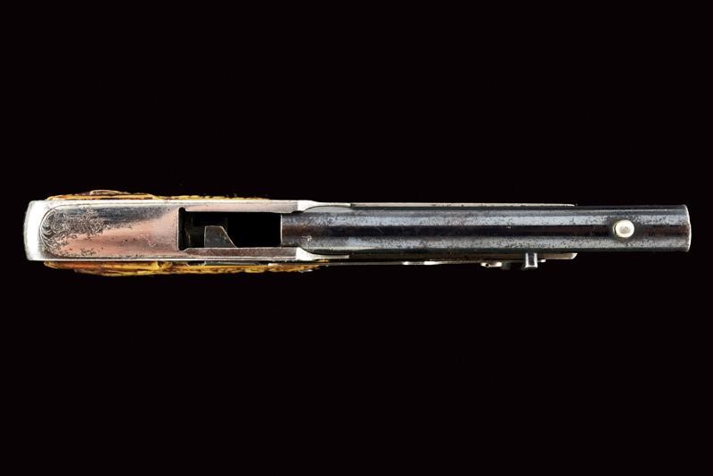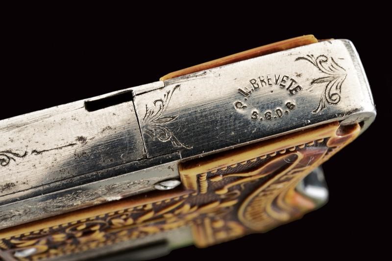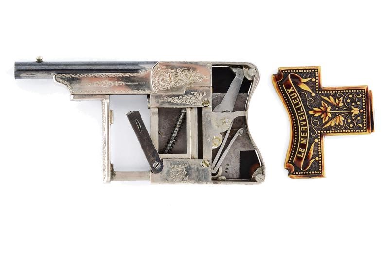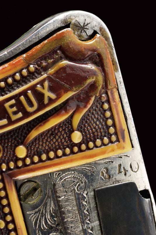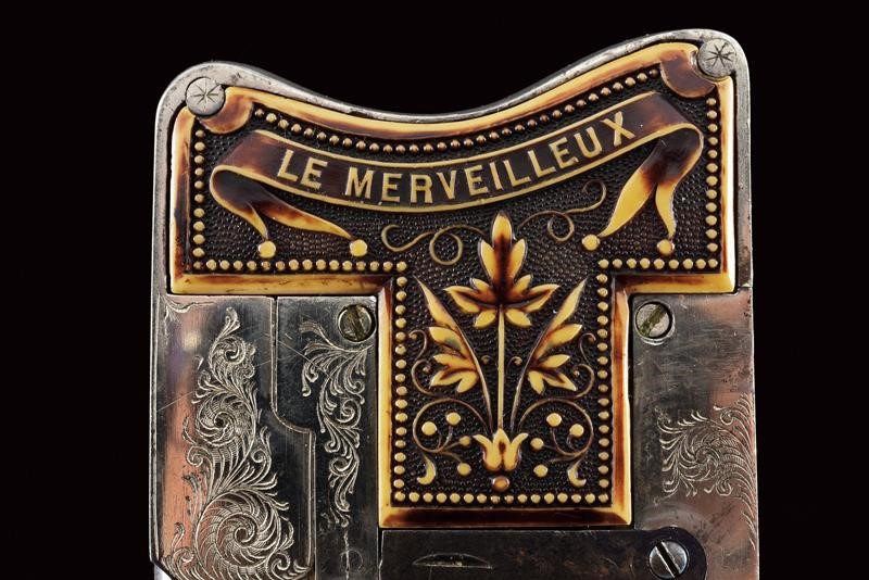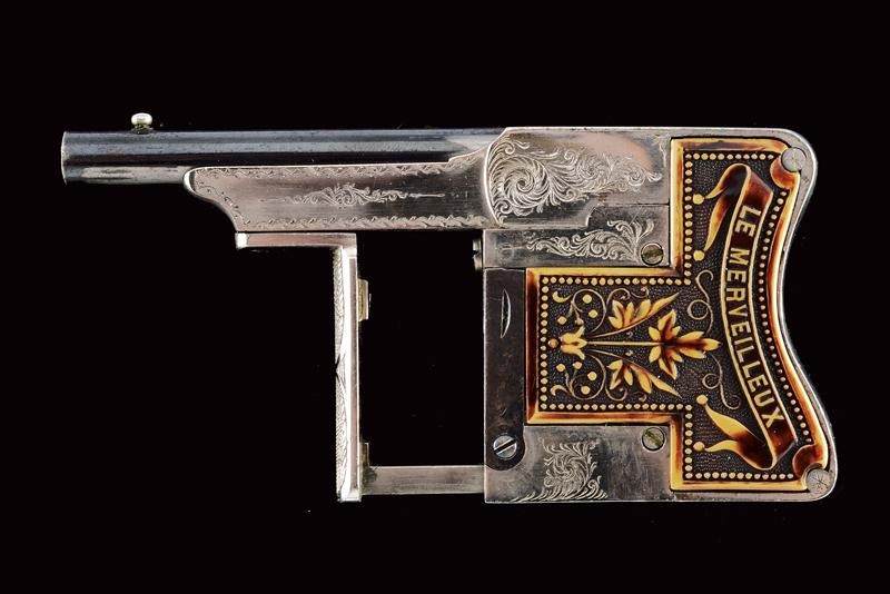 Canna tonda, rigata, brunita, con mirino, cal. 6 mm; castello in ferro finemente inciso a motivi floreali, guancette in corno di cervo scolpito a motivi floreali e con iscrizione "LE MERVEILLEUX". Molto rara.