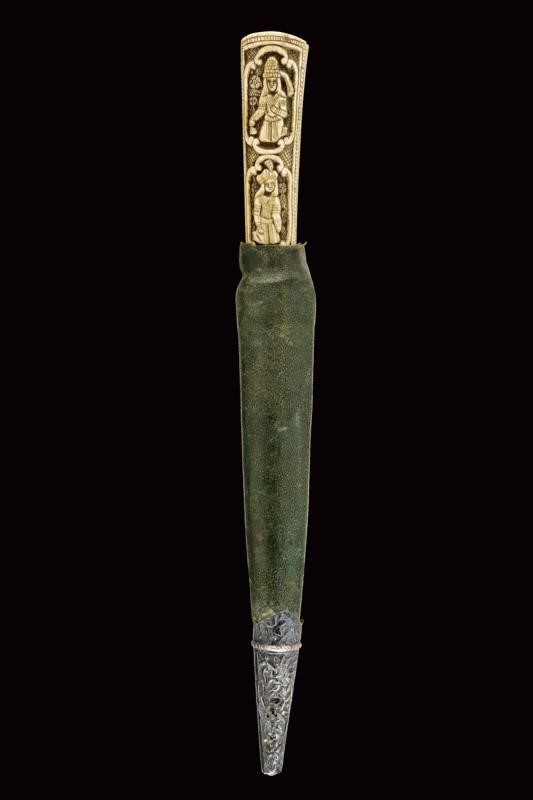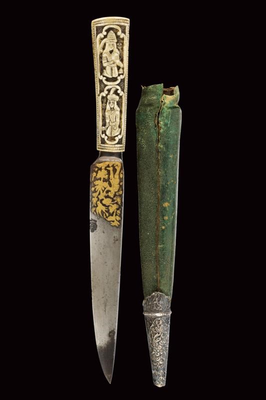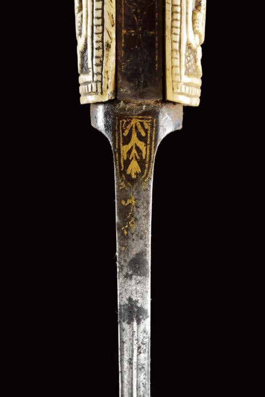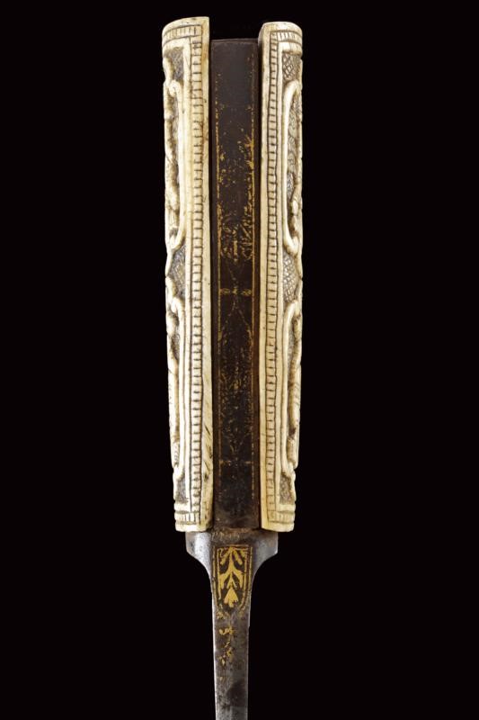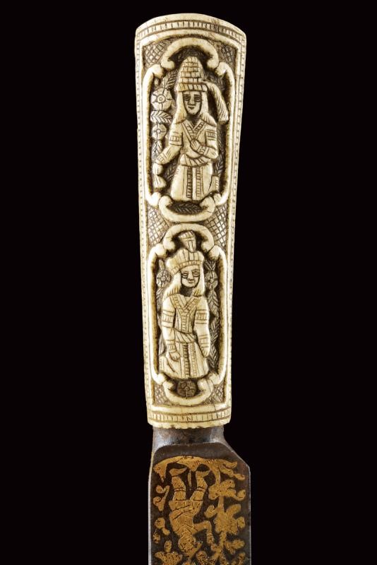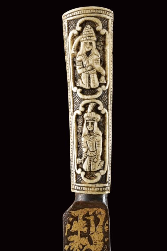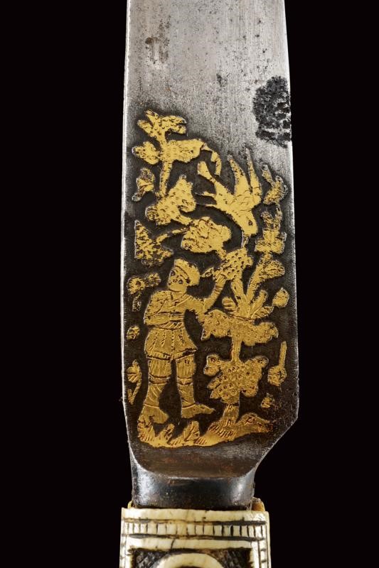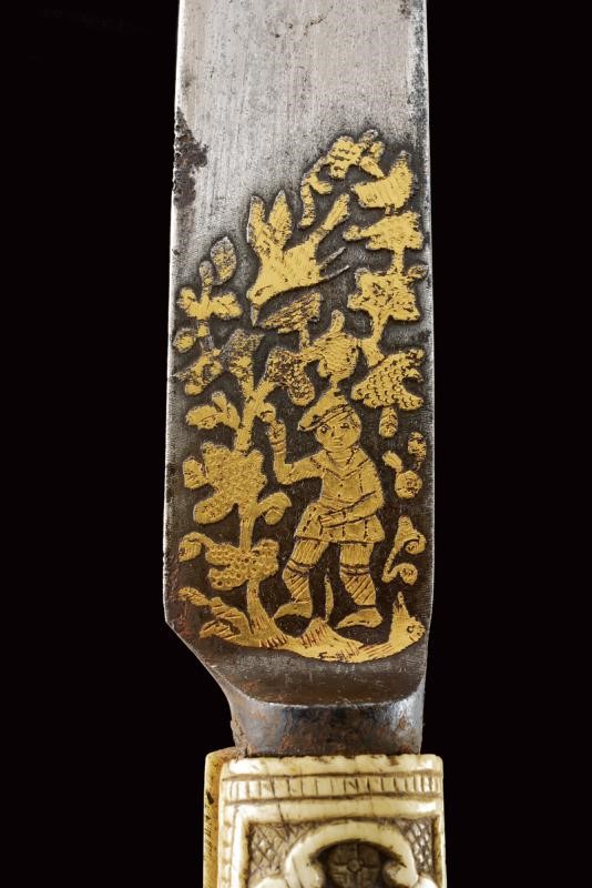 Robusta lama a un filo in damasco (zone con danni da ruggine), la base con meravigliosa scena recante una figura maschile ed un uccello nel bosco entrambi incisi e con agemine in oro giallo su fondo scuro. Impugnatura con guancette in osso, entrambe scolpite con due personaggi in bassorilievo incorniciati e su fondo floreale e a rete. La cornice in ferro con resti di decorazioni o iscrizioni in oro. Fodero in legno rivestito di cuoio verde, il puntale (staccato) in argento scolpito a motivi floreali con un nucleo in ferro.