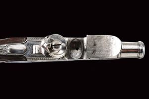 Canna liscia a cannoncino, incisa, svitabile, in calibro 10 mm. Castello del tipo boxlock con finissime incisioni a trofei e a motivi floreali, la culatta della canna firmata "Delety Paris Rue Coquilliere" sotto a saette e nuvole. Il collo del cane inciso a pesce su entrambi i lati. Sicura esterna. Grilletto a scomparsa. Calcio in legno leggermente intagliato a motivi floreali in bassorilievo. Meccanica funzionante. Rara pistola dell'epoca di Luigi XV.