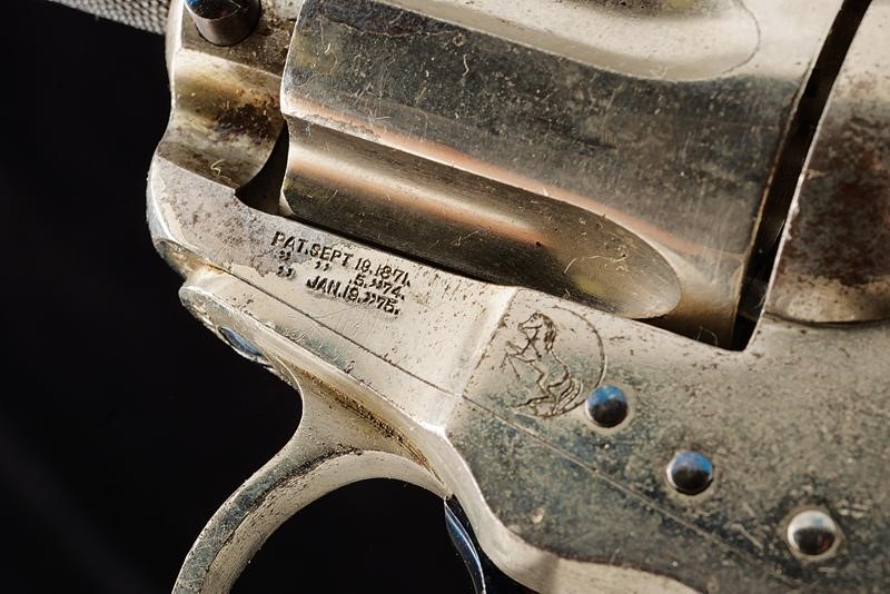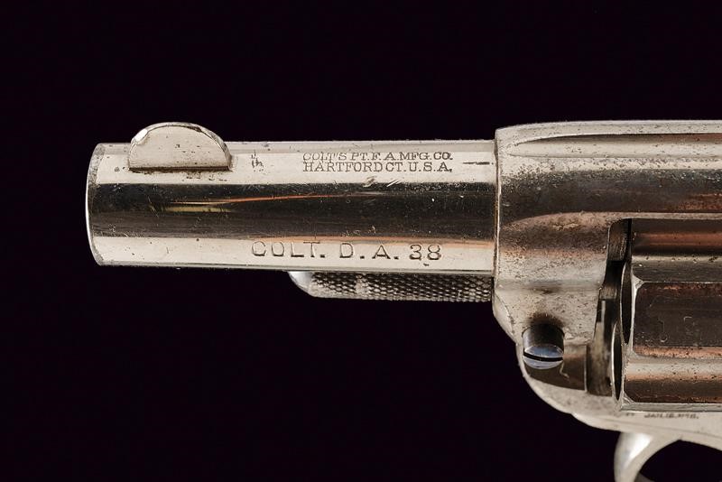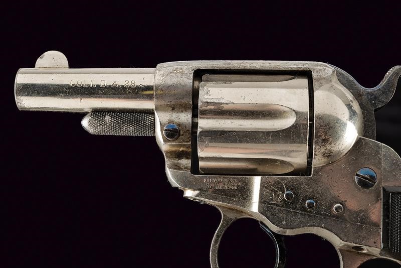 Canna da 2-1/2" con indirizzo della ditta in due righe al dorso e dicitura "COLT D.A. 38". Anima pulita, rigatura visibile. Tamburo a sei colpi. Meccanica funzionante sia in singola che doppia azione. Castello con brevetti fino al 1875 e cavallino rampante. Nichelatura antica presente al 75%. Grilletto e cane con resti di brunitura antica color blu. Guancette in gommadura zigrinata ben conservate, con cavallino della ditta in rilievo. Matricole coeve "112xxx" su castello, ponticello e impugnatura. Lo sportellino numerato "11".