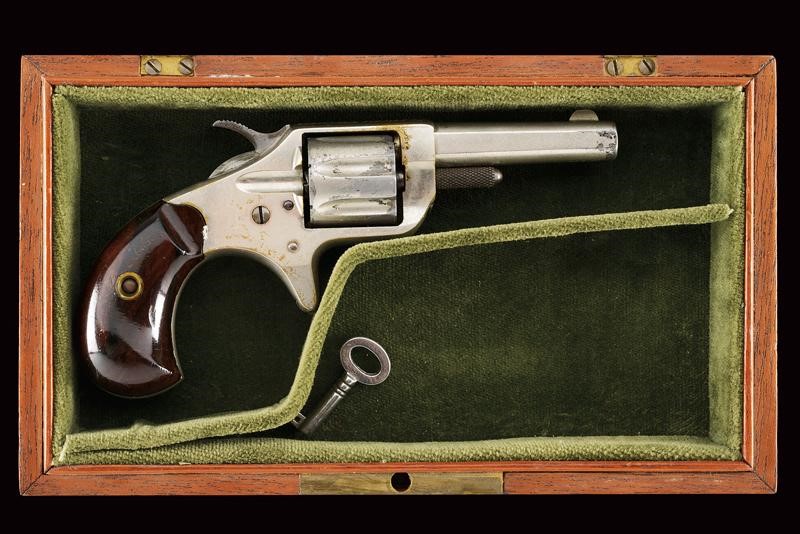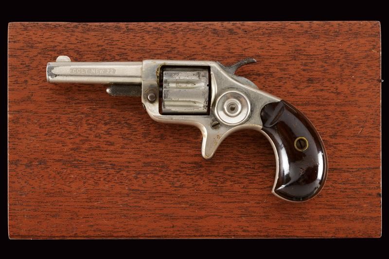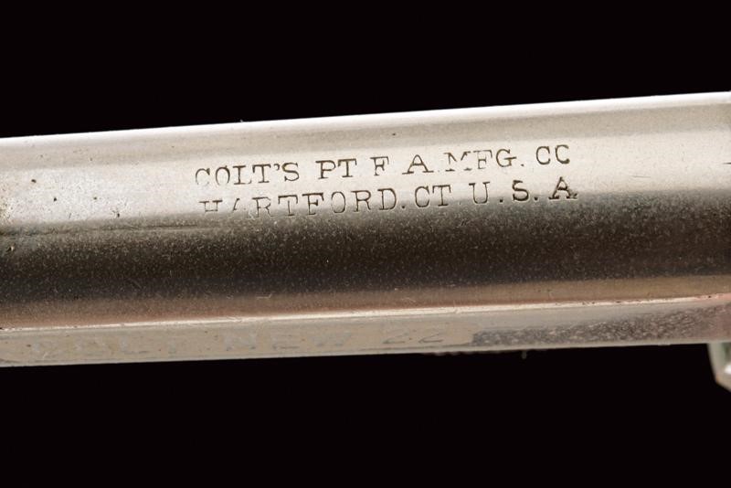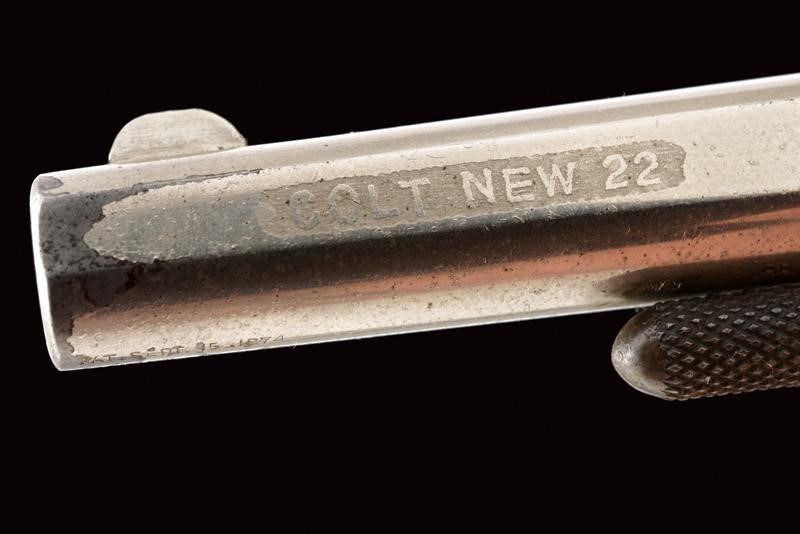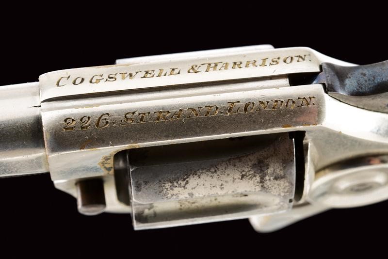 Canna con indirizzo, mirino e scritta laterale "Colt New 22", cal. 22, tamburo a sette colpi, castello con 80 % della nichelatura originale e con marcatura del calibro, guancette in legno. Matricola "28xxx". La cornice marcata "COGSWELL & HARRISON 226 STRAND LONDON". Meccanica funzionante. In cassetta di legno (probabilmente di epoca successiva) foderato in velluto verde e con chiave.