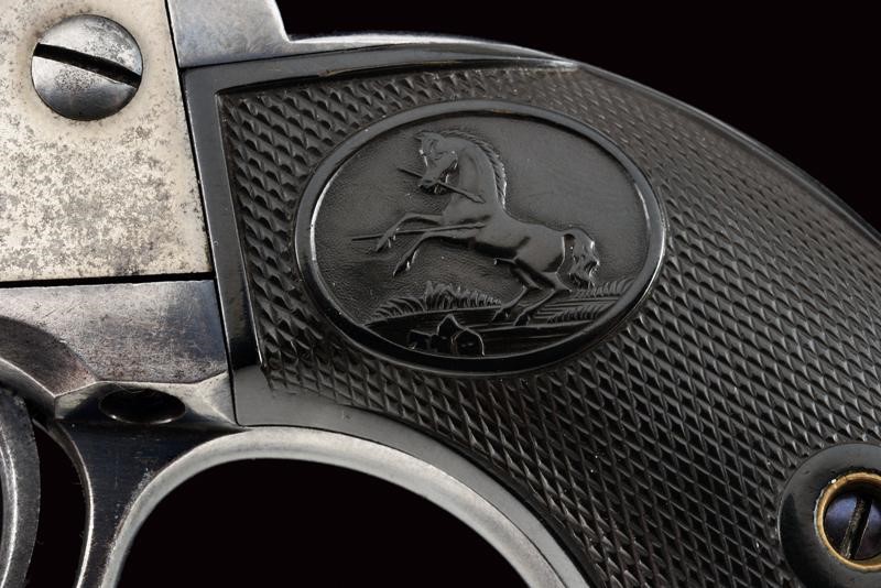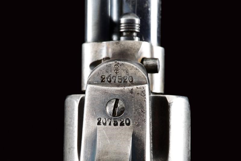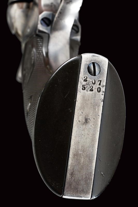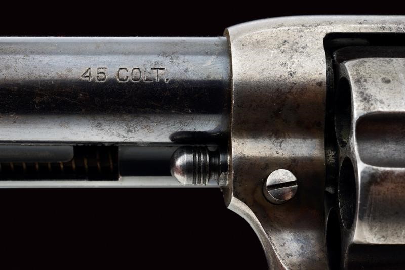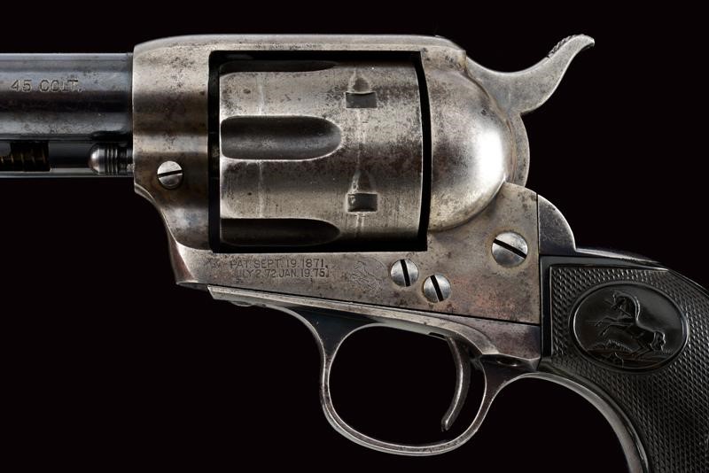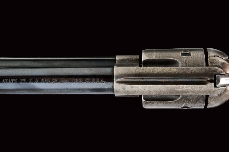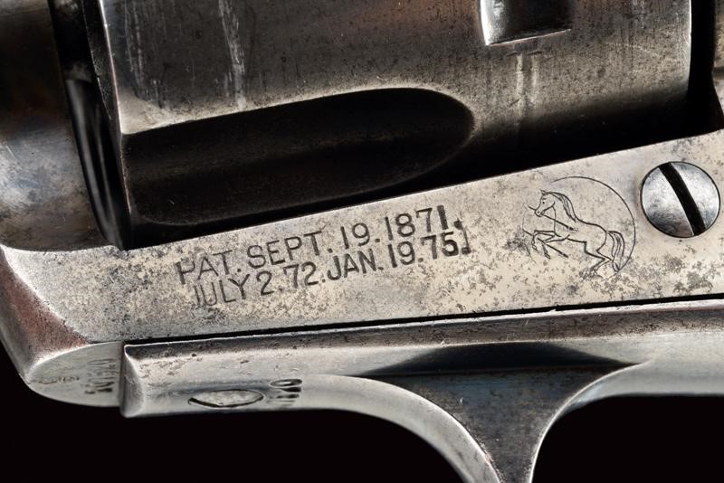 Canna tonda rigata (anima pulita, rigatura ancora visibile) da 7-1/2 pollici, brunita, dotata di mirino e con marcatura "- COLT'S PT. F. A. MFG. Co HARTFORD CT. U.S.A. -", recante sul lato sinistro "45 COLT." Punzonata sul lato inferiore e con dicitura "45' 1.28'' 6.3 GRS N.C 255 GRS" e con marchio del banco di prova di Londra. Tamburo scanalato a sei colpi. Castello con marcatura dei brevetti del 1871, 1872 e 1875 in due righe e con marchio del cavallino rampante. Matricola "207xxx" su castello, ponticello e impugnatura. Sul castello anche punzone del banco di Prova di Londra. Guancette zigrinate in gommadura con cavallino in rilievo. Lievi resti di tartarugatura sul castello e tracce di brunitura sul ponticello. Meccanica ben funzionante.