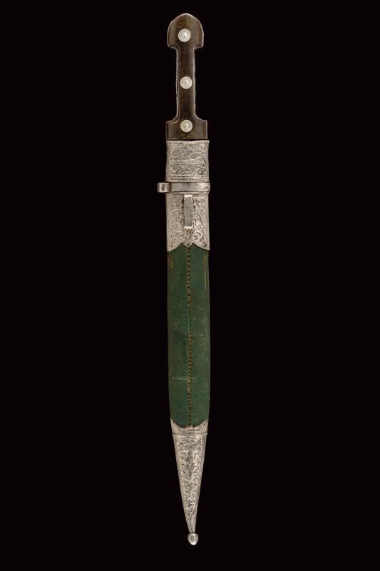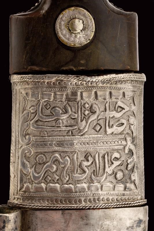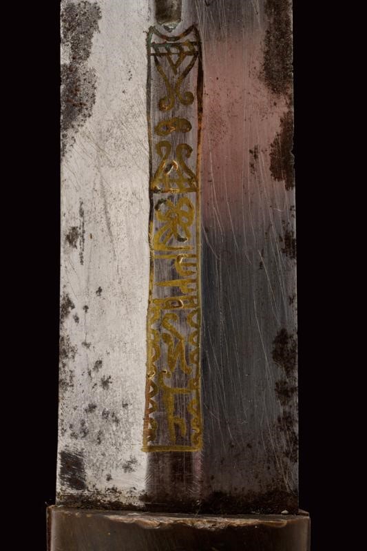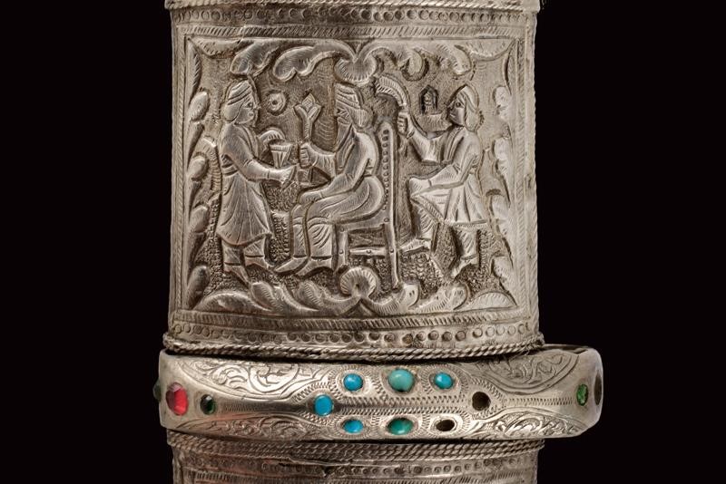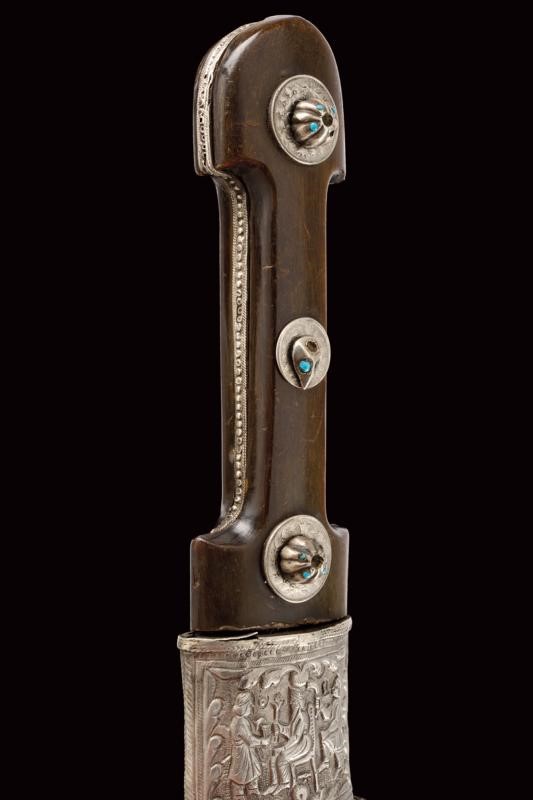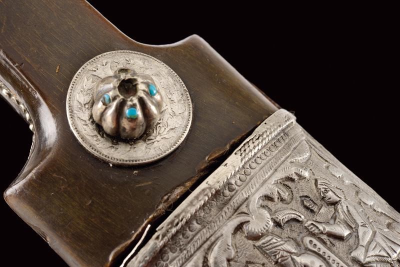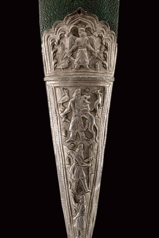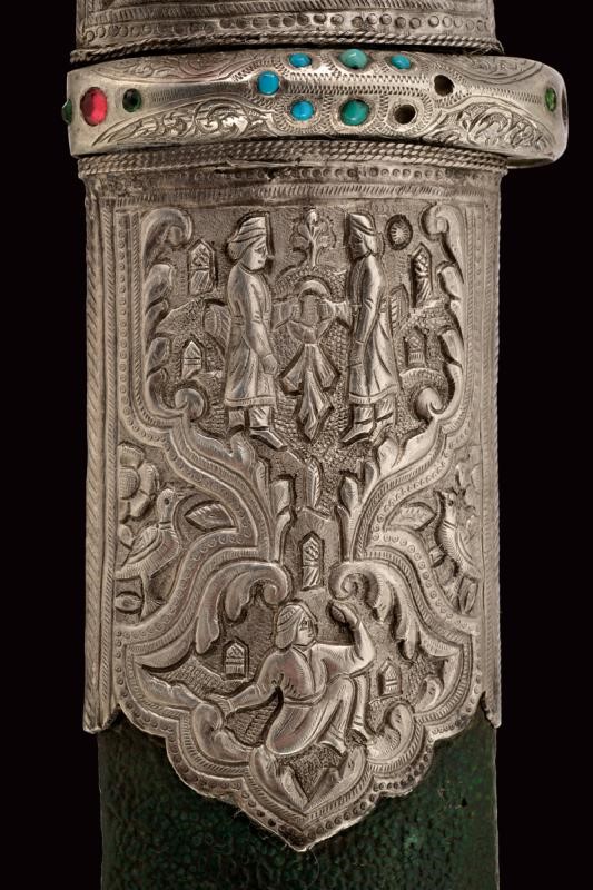 Larga lama dritta a due fili, con base piatta e recante sul lato di terza decorazioni in metallo giallo e l'iscrizione: "Amal-i Muhammad 1322" (Lavoro di Muhammad nell'anno 1904-5"), poi scanalata in mezzeria ed infine costolata verso il debole; zone con danni da ruggine. Impugnatura di forma tipica con guancette in corno di bufalo e rivetti in argento decorati con turchesi (mancanze) su monete persiane in argento, su entrambi i lati. La fascia centrale in argento perlinato. Fodero in legno rivestito di cuoio verde cucito con filo metallico. Fornimenti in argento maestosamente sbalzati e incisi con scene di corte, con effige di un angelo, guerrieri (uno in combattimento con una tigre), animali e decorazioni floreali in rilievo su sfondo a granuli. La fascia con anello di sospensione decorato con turchesi e pietre colorate in vetro (mancanze). Il retro con due bande recanti iscrizioni in arabo: "sahibuhu qurban-èali èamal-i ibrahim" ("èIl proprietario Qurban-èAli. Lavoro di Ibrahimí") e sbalzi con uccelli e decori floreali. Largo passante. Molto rara.