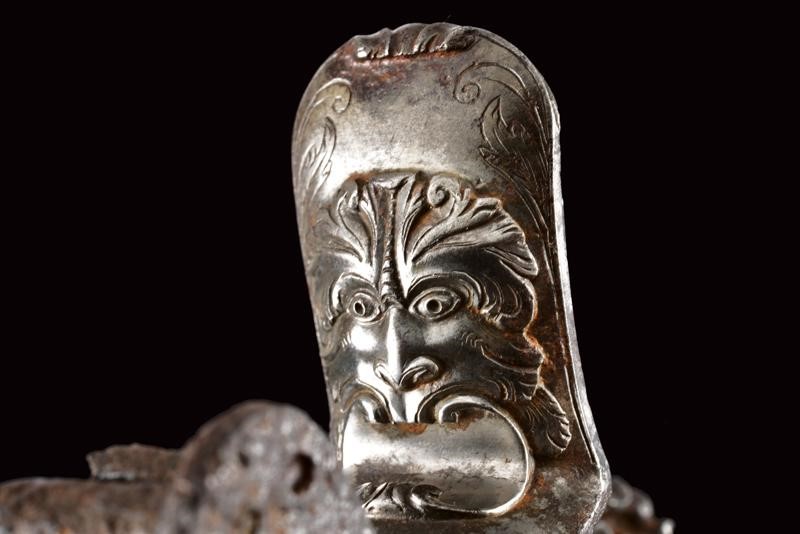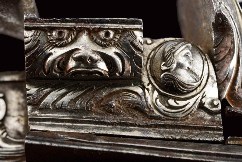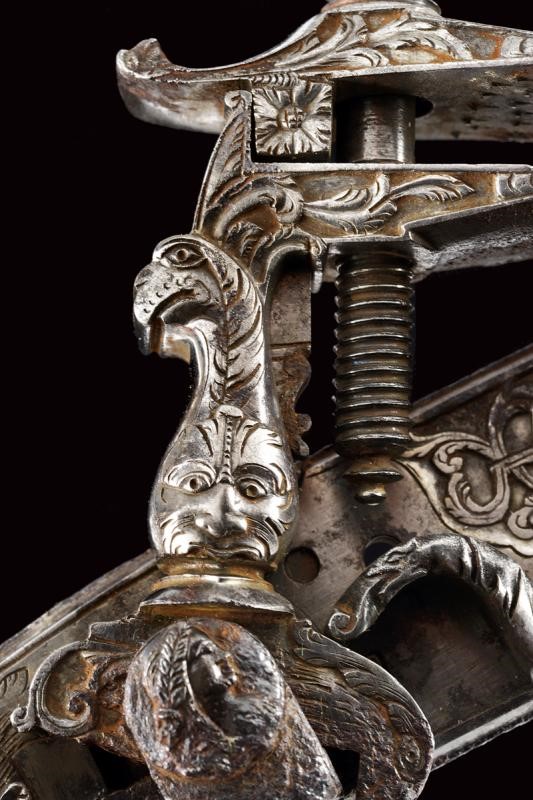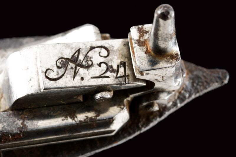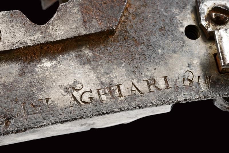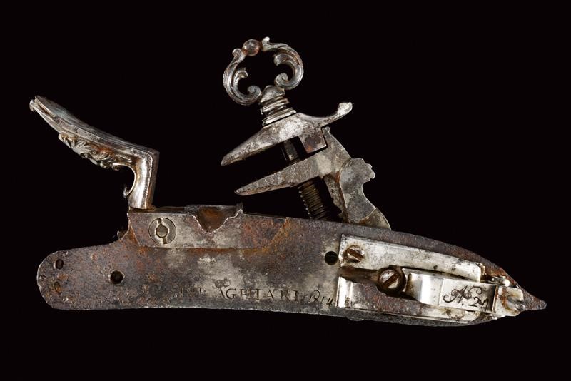 Cartella piatta con margine a lista ribassata recante alla codetta un bel mascherone in rilievo. Il cane tutto intagliato sul lato anteriore, con grottesche al collo e racemi alle ganasce. La vite del morsetto con bel traforo a foglie. La briglia con resti di un volto. La molla esterna intagliata a serpente, lo scodellino con mascherone, un altro bel volto grottesco in rilievo sul dorso della martellina. Alcune aree con forti intaccature o danni da ruggine. Il retro recante resti di firma: probabilmente "...ANI" o "...INI" e la dicitura ben visibile "AGHIARI" con l'anno "1814". La meccanica marcata "N. 24" Notevole acciarino con decori di gran qualità. Molto probabilmente la firma si riferisce a Guardiani.