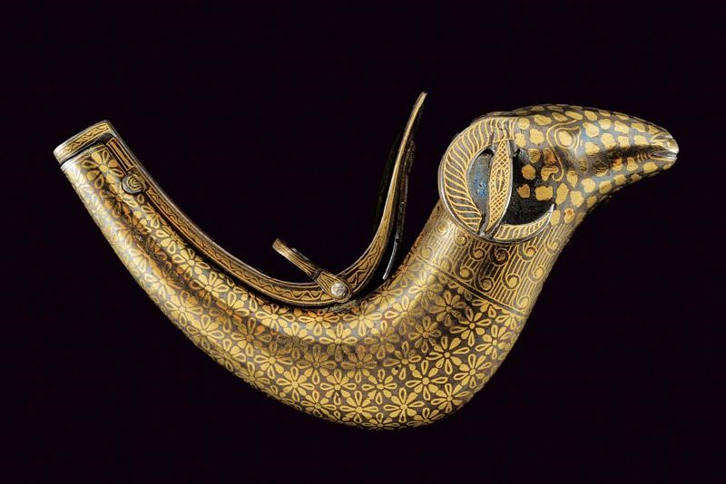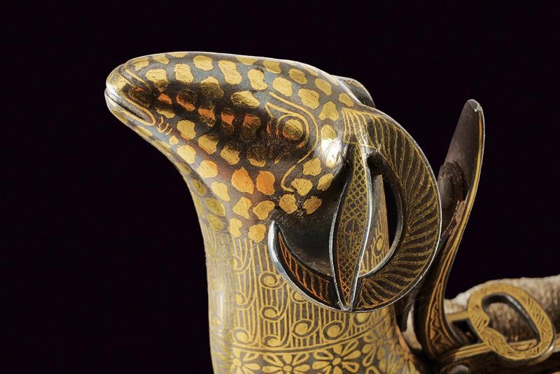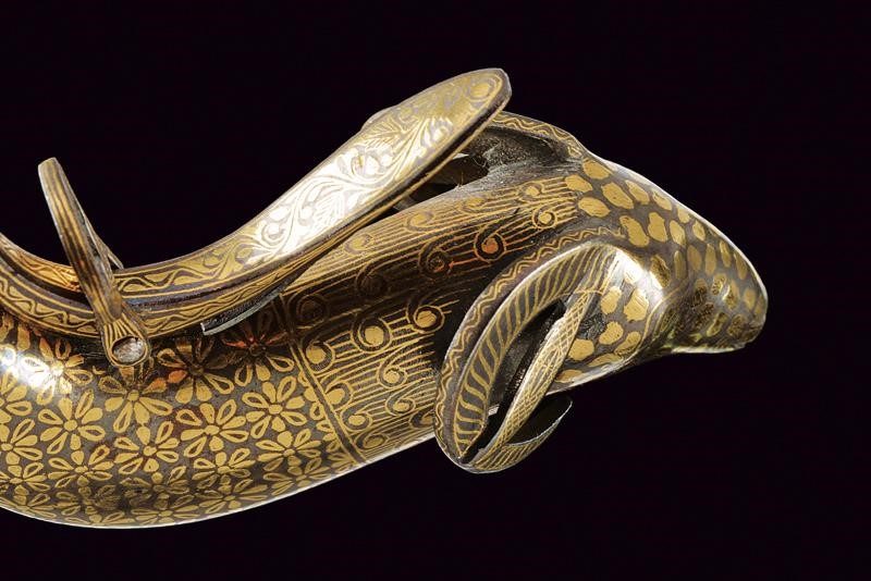 In ferro, di forma incurvata, con testa di ariete e molla di chiusura. Completamente ageminata in oro a motivi floreali e geometrici. Anello di sospensione.