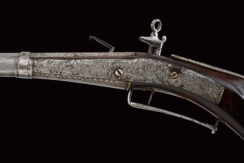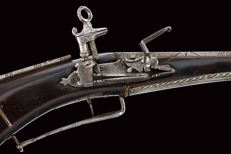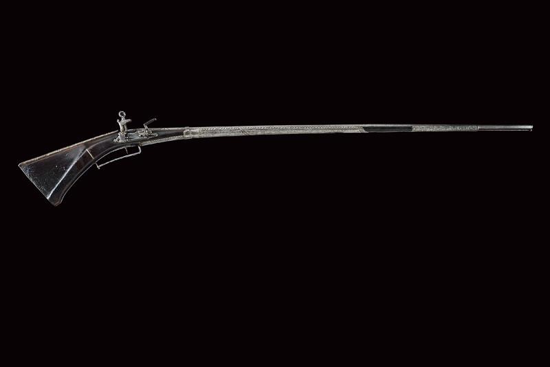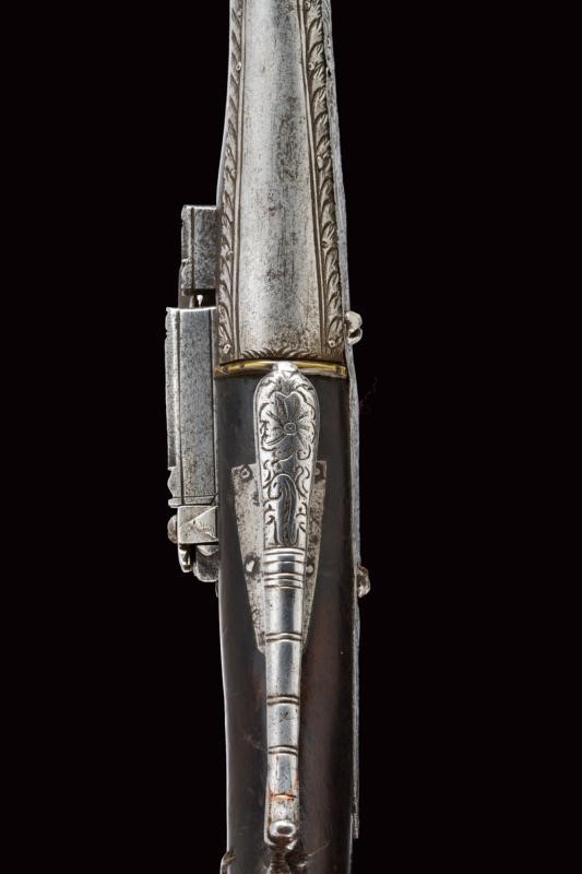 Lunghissima canna ottagonale liscia, recante alla base incisioni a cornici e con un sole antropomorfo. Volata lievemente strombata, cal. 12 mm. Forse una riparazione al centro. batteria alla micheletta con resti di incisioni. Meccanica funzionante ma tendente a incepparsi. Cassa lunga in legno con tipica pala di forma quasi triangolare. Fornimenti in ferro. Buona parte dell'astina rivestita da lamine in ferro parzialmente incise. Il lungo ponticello a guardia. Il dorso del calcio con fornimento tubulare lavorato a spire.