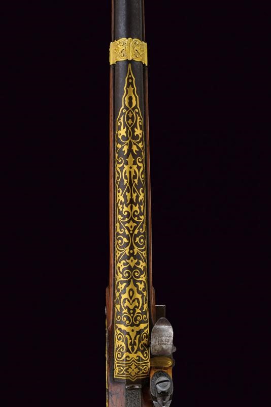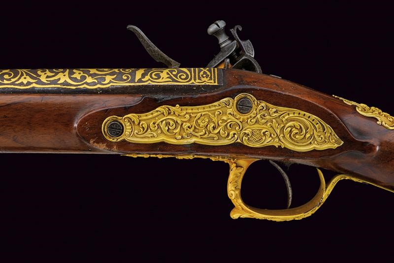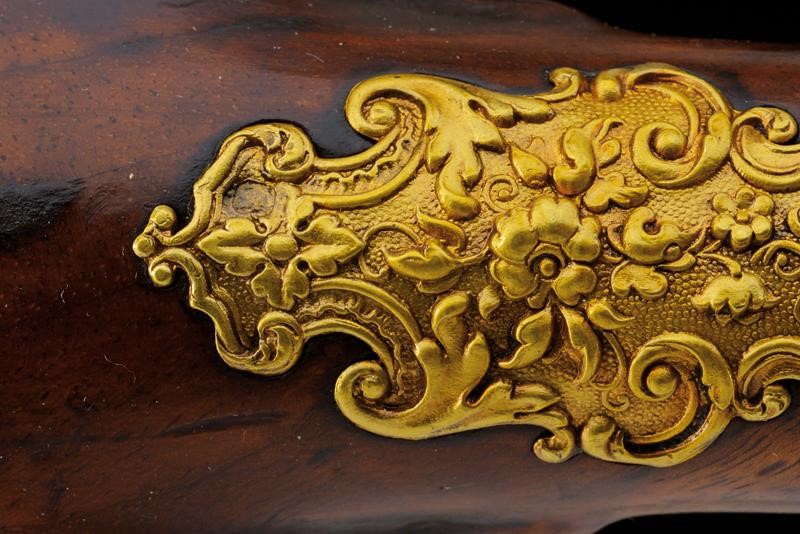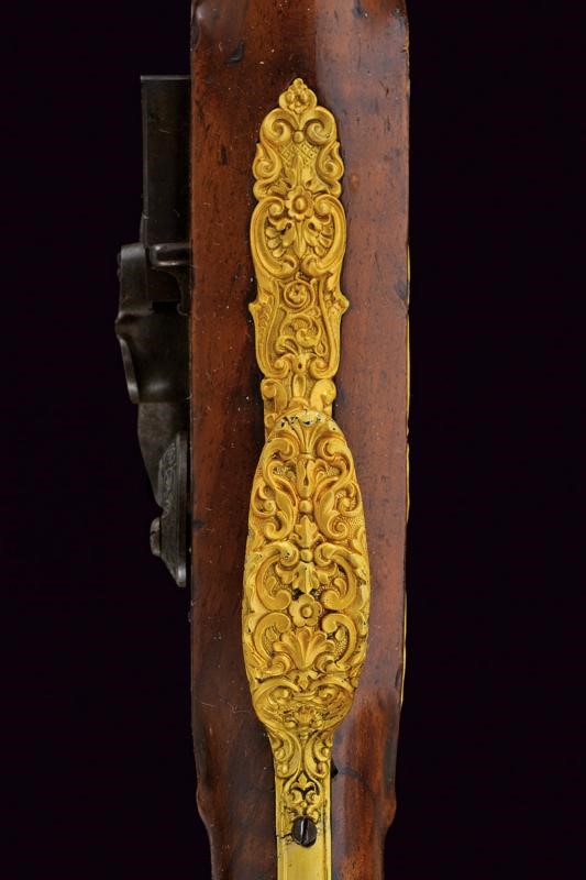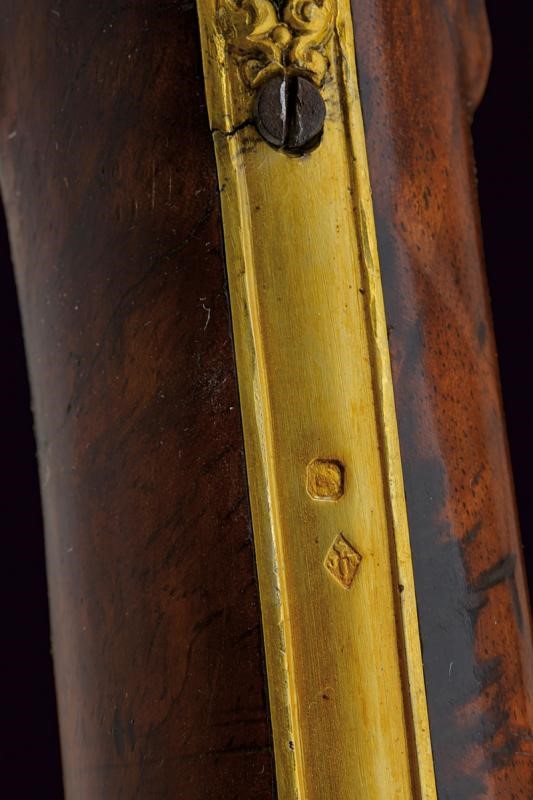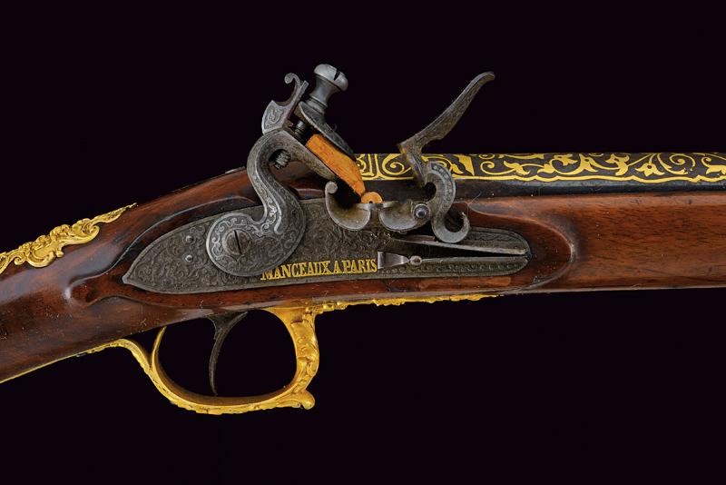Canna liscia, tonda, con base ottagonale e ageminata in oro a motivi floreali, cal. 18 mm; codetta incisa; bella batteria a pietra focaia, firmata in oro "MANCEAUX A PARIS", focone foderato in oro; cassa intera in radica, fornimenti in argento dorato, sbalzato a motivi vegetali su fondo granulato. Bacchetta in ferro.