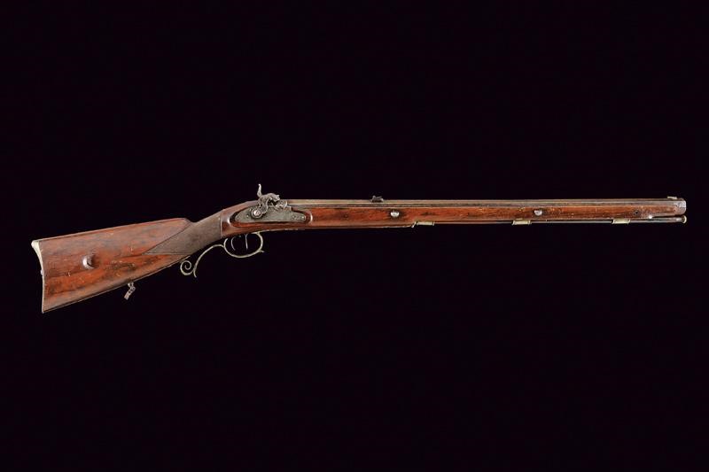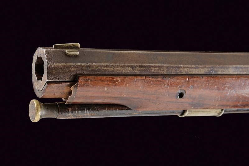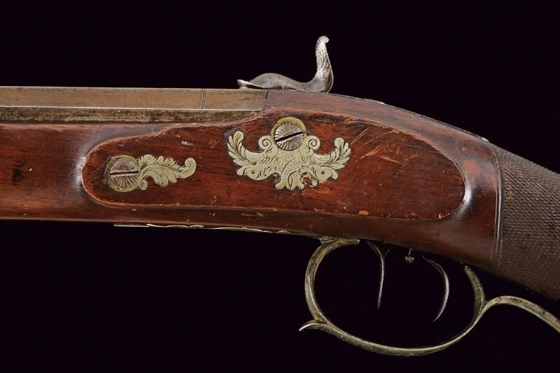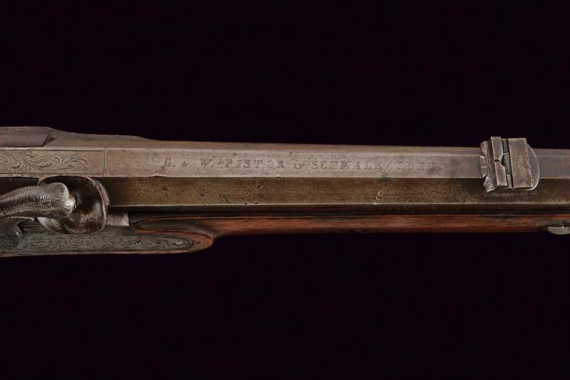 Canna ottagonale rigata, dotata di mirino e con alzo a fogliette in due altezze, recante al dorso la firma "G. & W. PISTOR IN SCHMALKALDEN". Cal. 14,5 mm. in volata. Anima con varie incrostazioni e segni del tempo, da pulire, rigatura visibile. Batteria a molla in avanti firmata come la canna e con incisioni a racemi. Il cane fortemente intaccato. Meccanica funzionante. Grilletto e stecher funzionanti. Cassa intera in noce con collo zigrinato, bocchino mancante. Calcio con patchbox. Fornimenti in metallo bianco incisi a motivi floreali. Bacchetta in legno con battipalla in ottone e cavastracci in ferro.