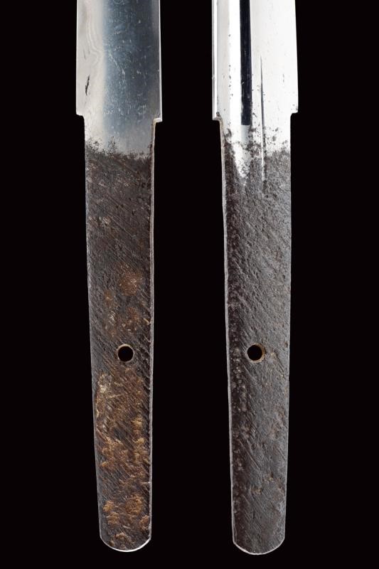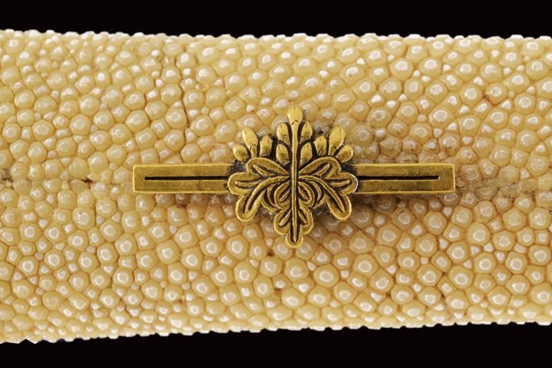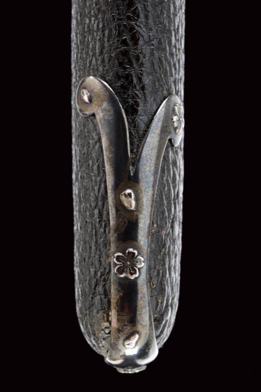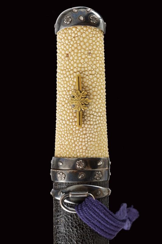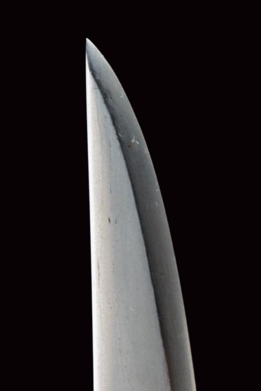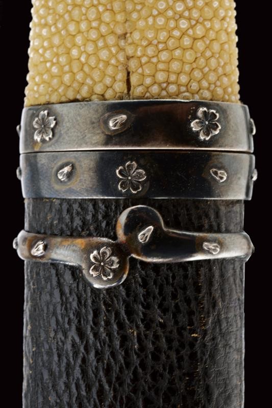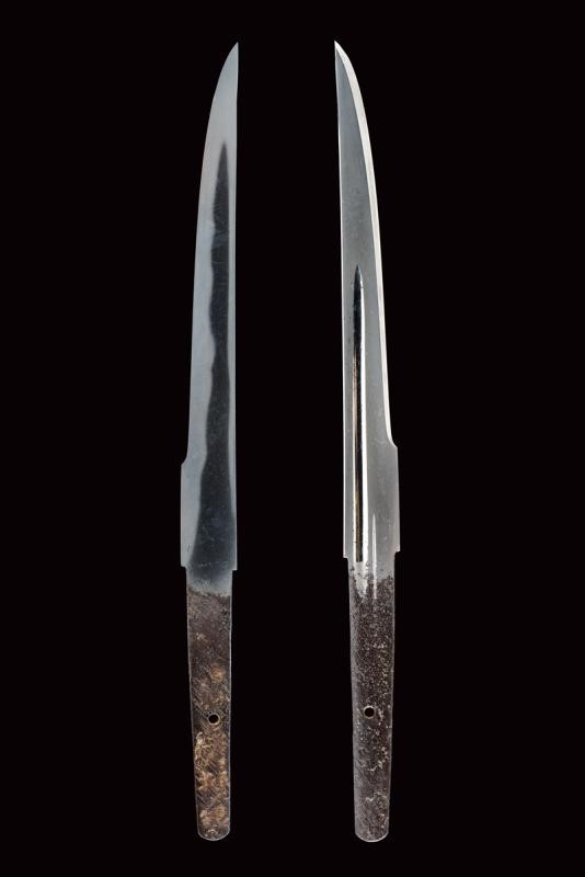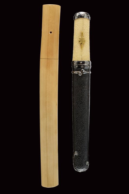 Nagasa (lung. 18 cm) con hamon e hada ben visibili con Bo-hi e bellissimo habaki in argento inciso. Nakago mumei con un mekugi-ana. In shirasaya. Bellissimo Aikuchi-Koshirae con fornimenti in argento decorato con fregi in rilievo di fiori e petali. Impugnatura rivestita in Dashizame (pelle di pesce bianca senza rivestimento, Tsukamaki). Menuki con Kiri in rame dorato. Saya rivestita di cuoio, Kojiri, Koikuchi e Kurikata decorati en suite. Tardo periodo Edo.