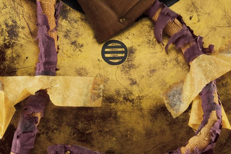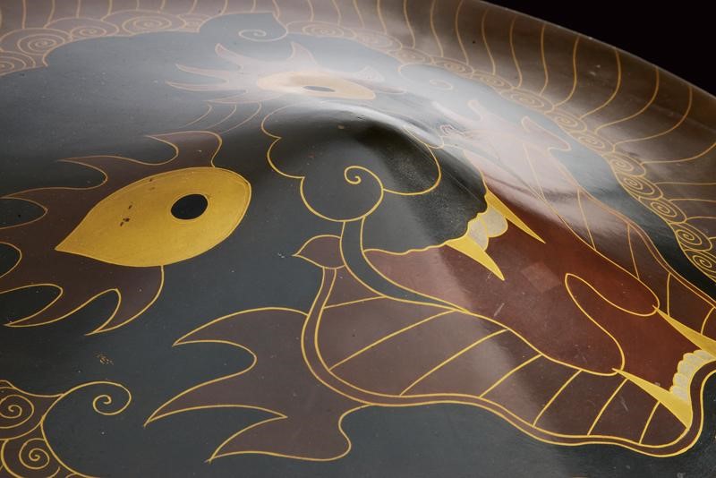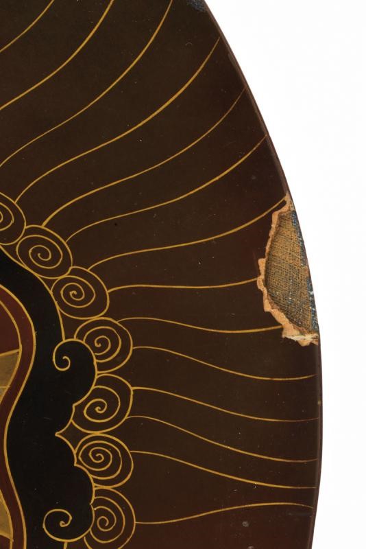 Leggera struttura kanshitsu, quasi piatta; con superficie laccata, decorata con effige di un grande drago o shishi nero, rosso e oro con bordo marrone e decorazioni in oro (piccole mancanze). Interno dorato e con piccolo mon, completo di Futon e lacci (danneggiati).