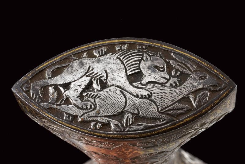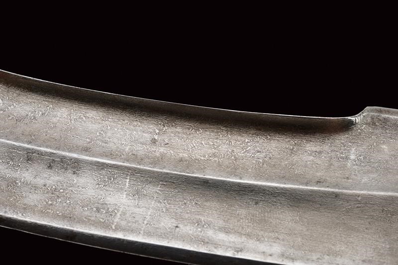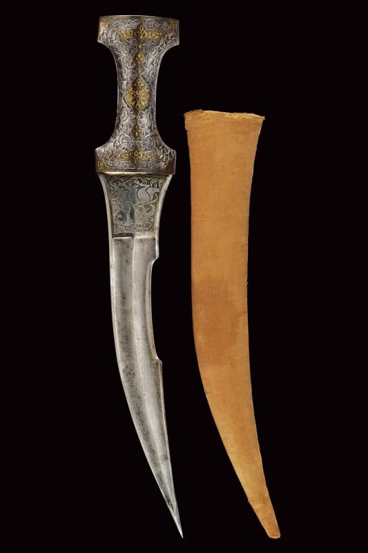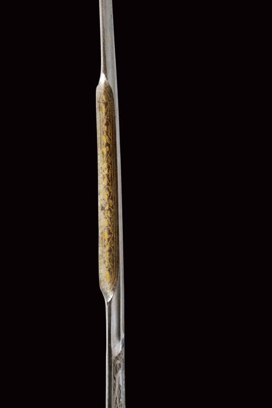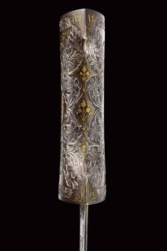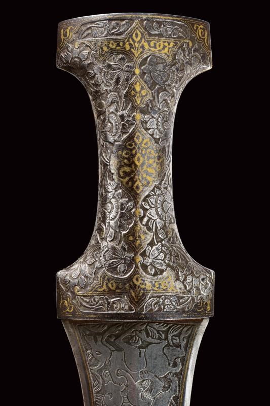 Elegante lama curva a un filo e controfilo in finissimo damasco, con punta rinforzata e con duplice sguscio, nervata in mezzeria. Dorso a "T" incavato e decorato in oro a motivi floreali, tallone a due fili finemente inciso con scena di caccia su fondo scuro e con cornice in oro. Impugnatura in acciaio a doppia "T" con bellissime incisioni ed intagli a motivi floreali in bassorilievo parzialmente ageminate in oro. Il cappellotto con un leone che da la caccia a un capriolo. Semplice fodero in legno rivestito di tessuto marrone. Rari gli esemplari di questo tipo cosÏ grandi e ben realizzati.