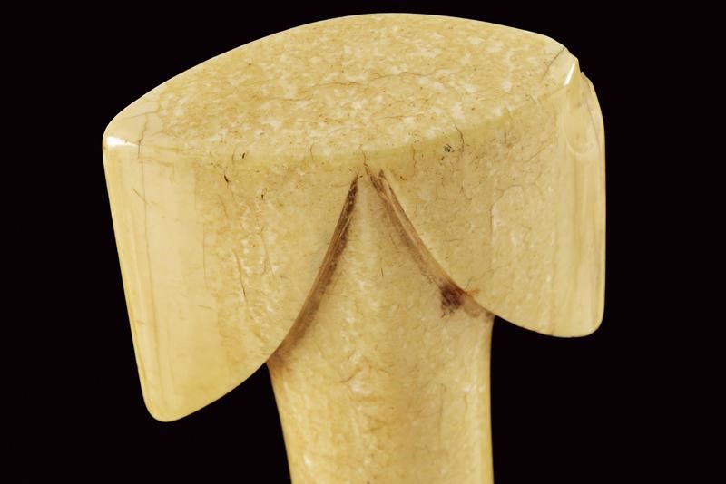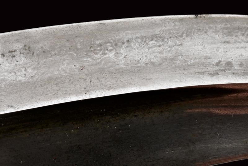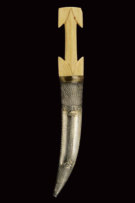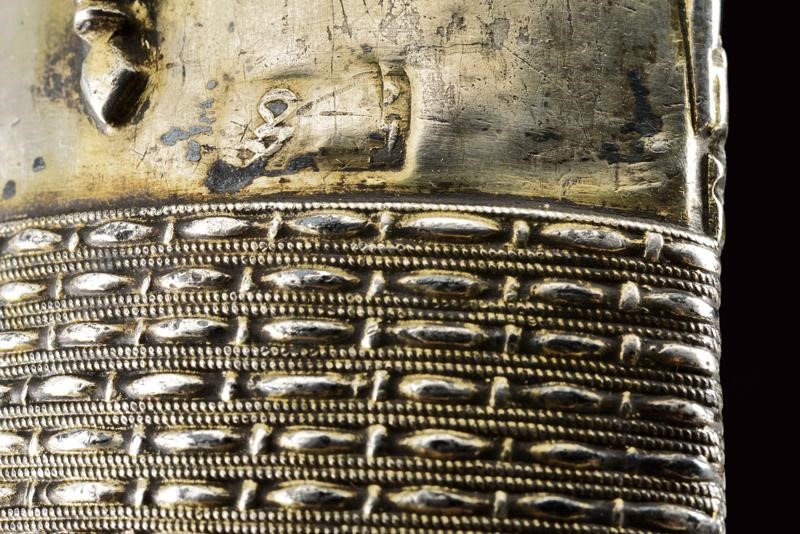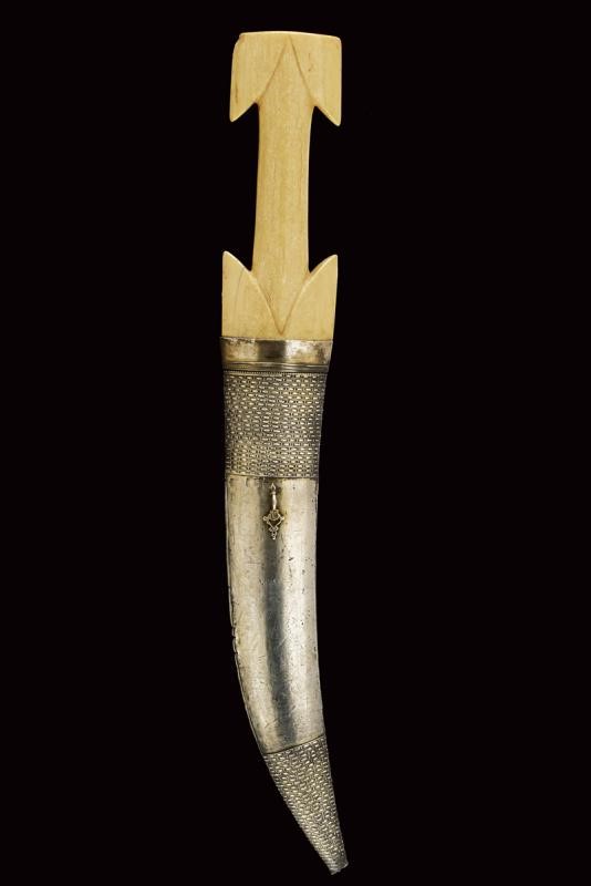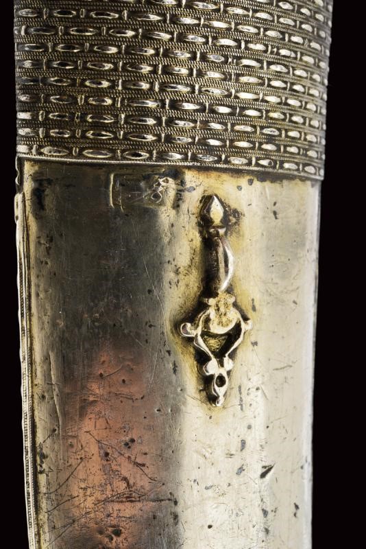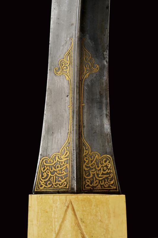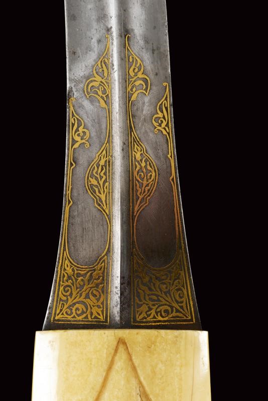 Ampia lama curva a due fili, in damasco, con nervatura centrale. Ageminata in oro al forte con iscrizioni in caratteri arabi e fiorami. Grande impugnatura in un solo pezzo in dente di tricheco (piccole mancanze e crepe). Fodero in legno rivestito con lamina d'argento decorata con bande, fornimenti incisi e parzialmente traforati. Il puntale mancante. Sul retro con un passante di sospensione e un punzone. Raro.