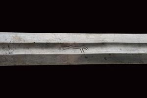 Larga lama dritta a due fili con sguscio centrale, recante al forte piccoli punzoni a stella seguita dal Lupo di Passau. Bel fornimento in ferro con elso a larghi bracci dritti decorati a nodi con segmenti di onde e quadri e con grandi sfere lavorate a germogli alle estremità. Anello di parata con tre rami all'interno, decorato en suite. L'anello posteriore obliquo e dotato di occhiello da pollice. Il grande pomo lavorato en suite con le sfere dell'elso. Impugnatura in legno rivestita con pelle di razza, la parte superiore rastremata e munita di un anello di ferro al cambio. La ghiera lavorata come la base del pomo. Bellissima spada per il combattimento a piedi alla barriera.