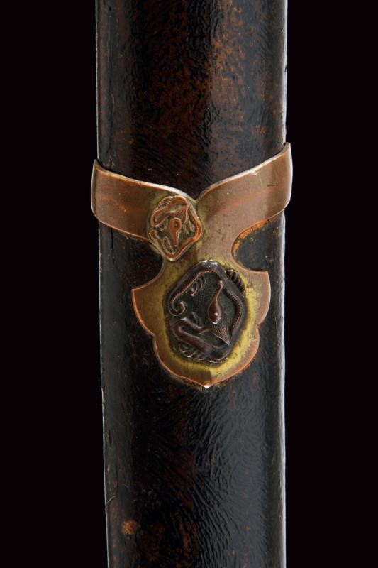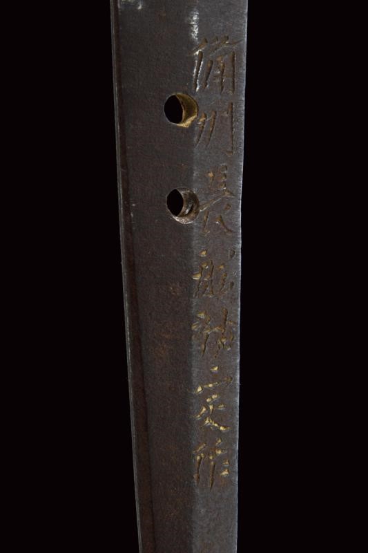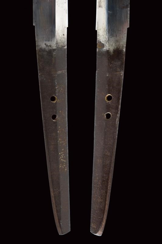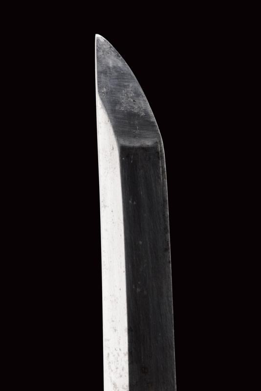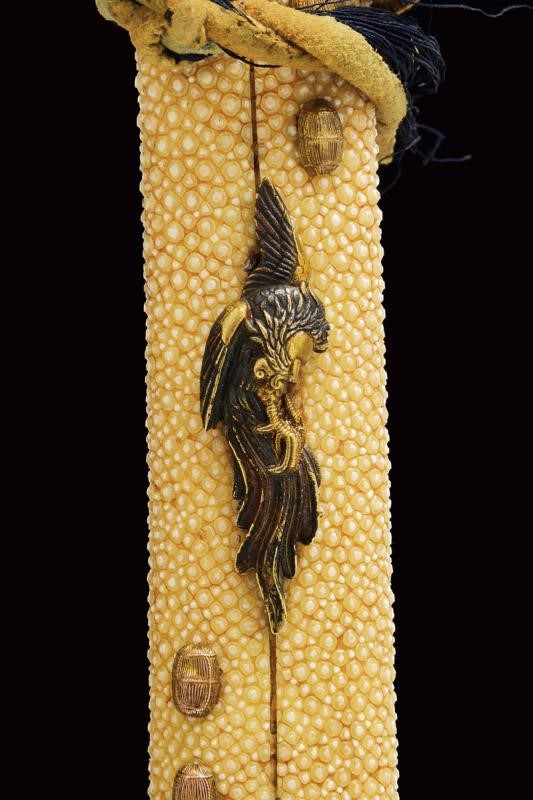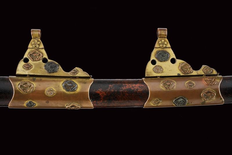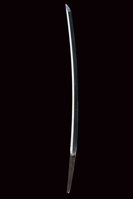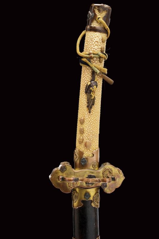 Lama shinogi zukuri. Nagasa 73,8 cm. (lama di polire di buona qualità) Hada poco visibile, Hamon: suguha. Periodo Sue-Koto tardo Muromachi (1560 circa) In montatura del tardo periodo Edo. habaki in metallo dorato. Shitogi gata tsuba con tema decorativo in rilievo ripetuto varie volte. Anche fuchi e kabutogane con gli stessi fregi in rilievo e resti di doratura. I menuki lavorati in rilievo a effigiare un gallo o il fenghuang. la tsuka con same recante altri fregi metallici bottonati e dorati. Saya in lacca rossa e nera, con fornimenti en suite.
