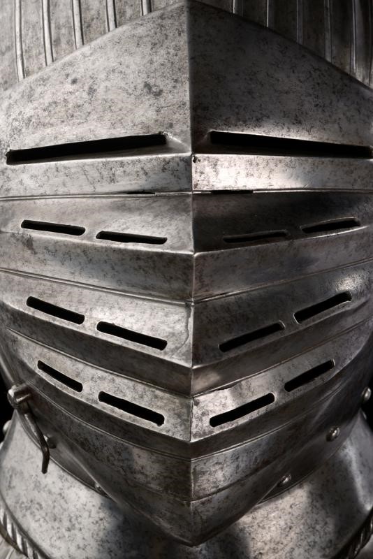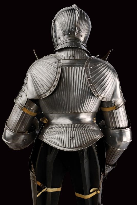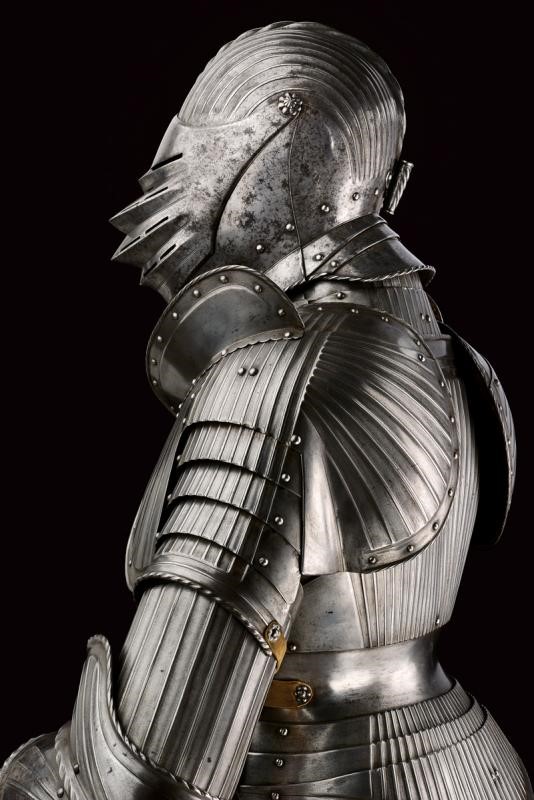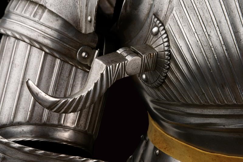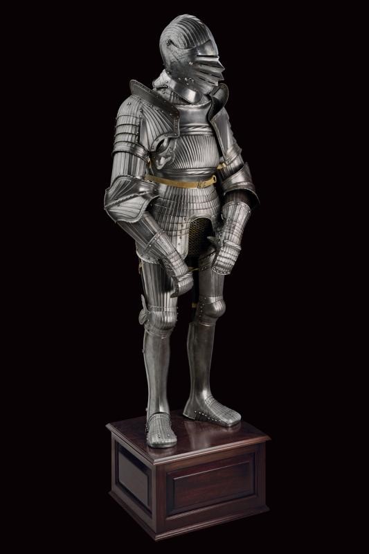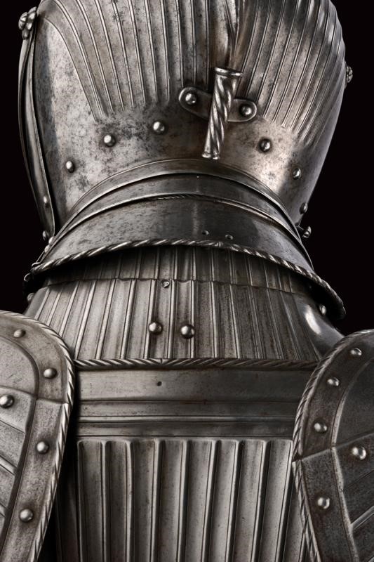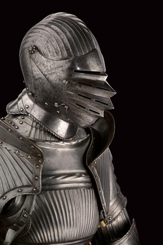 Elegante elmo chiuso da cavallo munito di coppo ornato a cannellini longitudinali delineati e alternati a sgusci, recante al centro la bassa cresta profondamente lavorata ad imitare un bel tortiglione con spire ben demarcate, in alto due fori (per il cimiero?). La visiera sana, lavorata a quattro fasce nervate trasversali e fortemente cuspidate al centro, tutte munite sul lato superiore di fori aeratori rettangolari, la parte superiore con le due fessure oculari. Il lato destro della visiera munito di manopola e con passante per il gancetto di fissaggio. La barbozza con il gancio per la visiera e il bottone a pressione di sgancio. Il guardacollo lavorato in un unico pezzo con la barbozza e munito di cordone lavorato a fingere il tortiglione. La parte superiore della gronda in un unico pezzo con il coppo, le altre due lame mobili e rivettate con cordone che prosegue il disegno del guardacollo. Su coppo, barbozza e visiera, nei punti di incontro dei vari elementi costitutivi dell'elmo nelle zone che presentano una conformazione a "V", all'interno è presente sempre una nervatura leggermente rilevata che delinea tutto l'elemento. Sul retro una pennacchiera in ferro. L'interno dell'elmo presenta patina uniforme in tutti gli elementi e tutti i ribattini che originariamente ne erano provvisti recano resti dell'antico cuoio. Goletta a quattro lame di padiglione, lo scollo con cordone lavorato a tortiglione, sul lato frontale e al dorso cannellini longitudinali delineati alternati a sgusci. Bellissimo petto di forma tondeggiante con spesso e ben rilevato scollo a cordone lavorato a tortiglione, poi con la parte alta liscia seguita da un nuovo cordone che attraversa il petto da sinistra a destra ed infine con tutta l'area centrale ornata a cannellini longitudinali e sgusci alternati, un ultimo cordone borda il fregio centrale in basso. Sul lato destro resta concava alla tedesca, pieghevole e ornata a spessi cannellini rilevati, la base raggiata. Schiena coeva quasi completamente rivestita con cannellini. Tre lame di batticulo ornate en suite. La grande falda anteriore a scarselle, anche queste con cannellini longitudinali e cordoni inferiori lavorati a tortiglione. Bracciali completi ornati en suite a cannellini longitudinali. Gli spallacci muniti di ampi guardagoletta fissati con ribattini. Lo spallaccio destro con incavo per la resta. Me manopole a mittene con lame sagomate a festoni. Gambiere complete e scarpe lavorate en suite con il resto ma realizzate in epoca pi˘ tarda per completare l'insieme. I cosciali e i ginocchielli con disegno a cannellini longitudinali e cordoni a tortiglione. Gli schinieri lisci e costolati in mezzeria. Anche le scarpe riprendono il tema decorativo del resto dell'armatura.