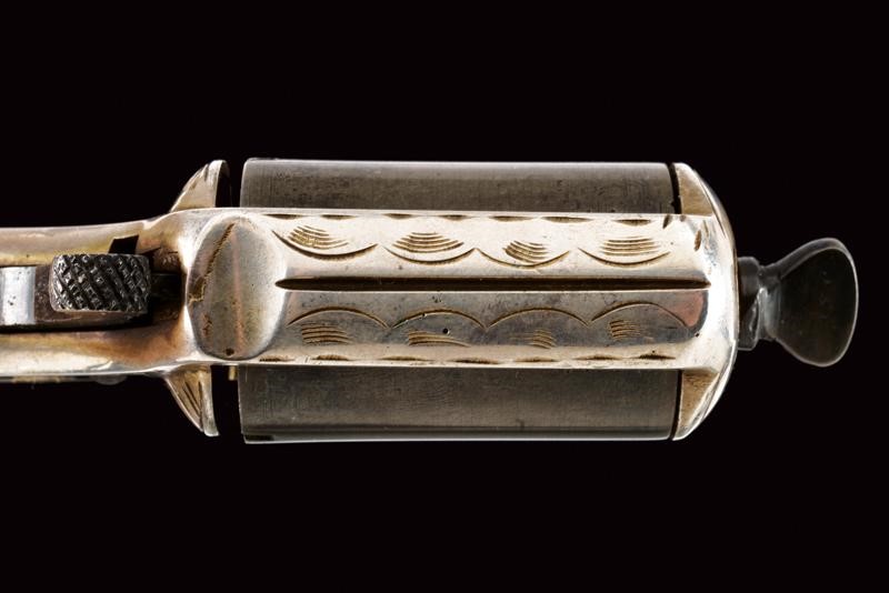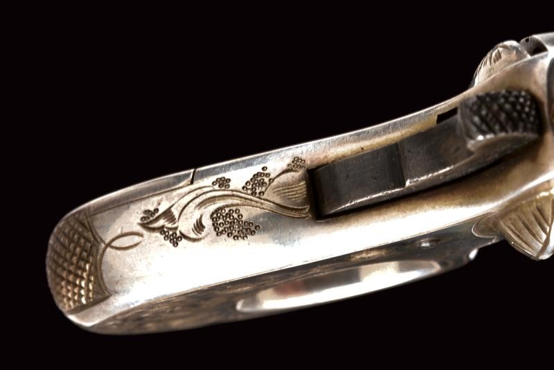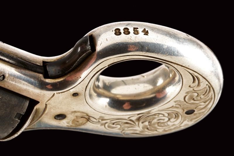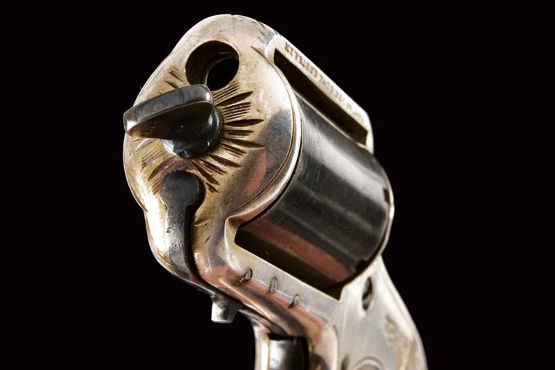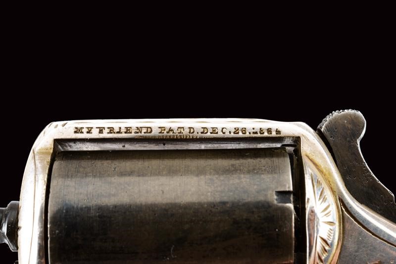 Tamburo a sette colpi, la cornice sul lato sinistro marcata "MY FIEND PATD. DEC. 26, 1865"; in metallo bianco (argento?) argentato ed inciso a motivi floreali, tamburo, vite e grilletto bruniti, matr. "88xx". Raro.
