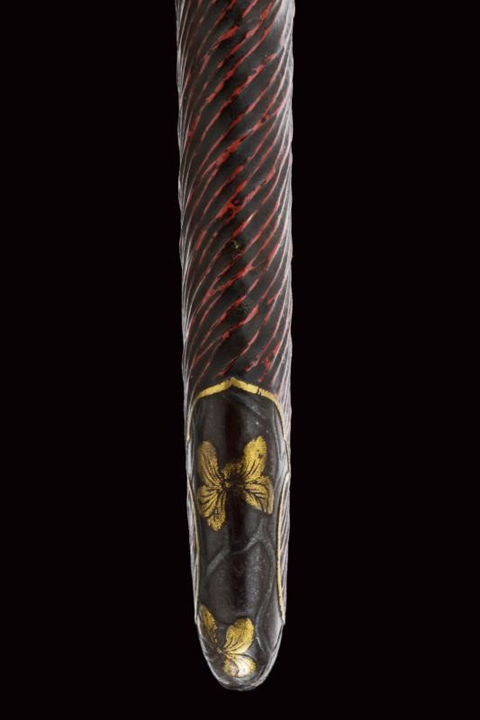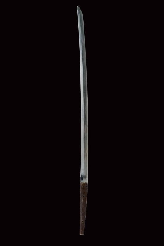 Lama shinogi zukuri iori mune. Nagasa 65,5 cm. Hada: muji molto ben forgiato. Lo hamon: komidare ko nie nioi nijuba. Epoca Kanbun Shinto. Suriage. Scuola Tokuden. Montata in bellisimo Koshirae di scuola Higo del tardo XVIII secolo. Habaki in argento. tsuba-mei di forma maru, in ferro con raffinato decoro a nuvole intagliate. Fuchi con fiori argentati e resti di dorature. Kashira ornato en suite di foggia ondulata. Vecchia tsuka ito. Saya con lacca rossonera lavorata a onde a formare un vortice attorno al fodero. Kojiri in ferro con decoro a racemi e fiori dorati.