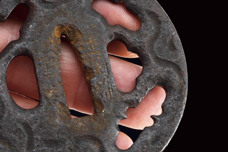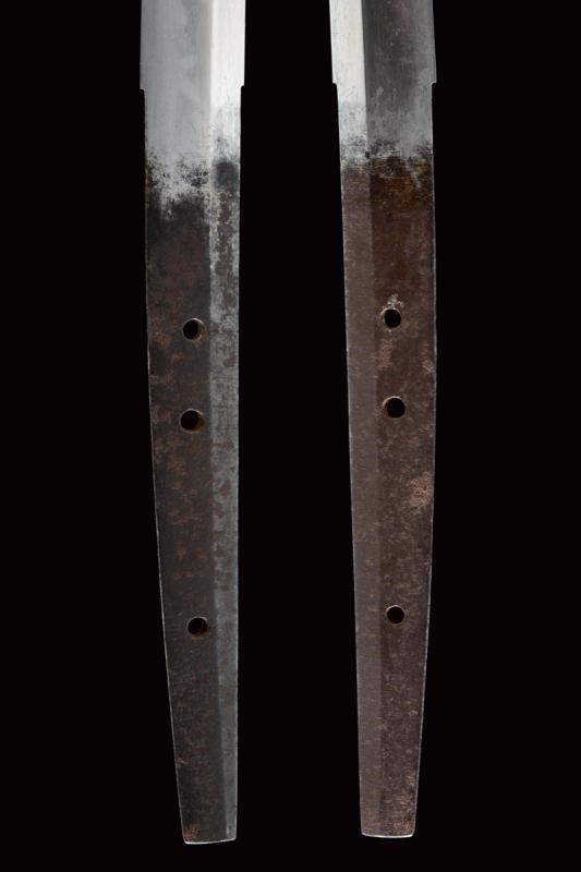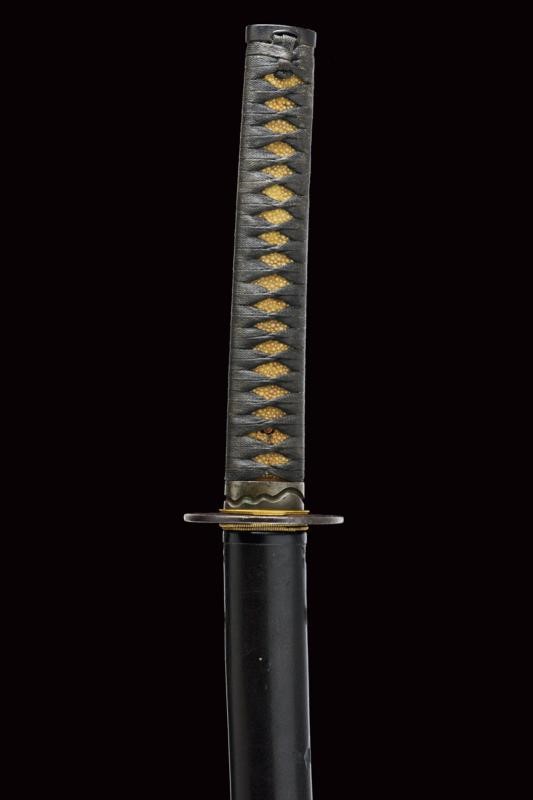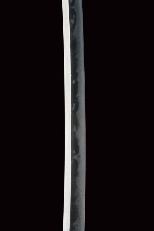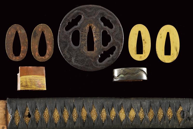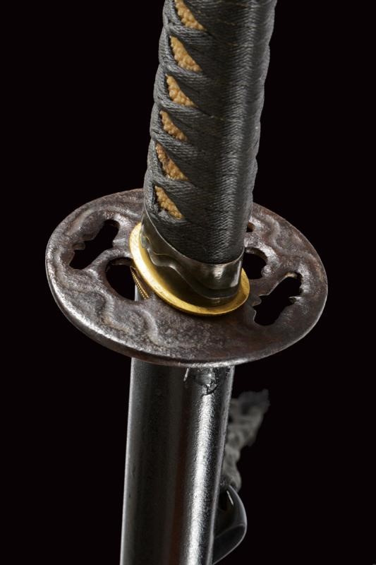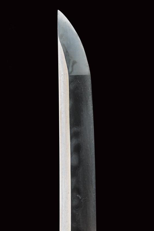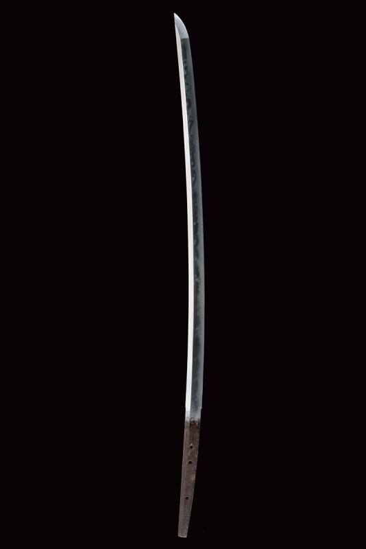 Lama shinogi zukuri iori mune. Nagasa 67 cm. Hada: itame nagare masame. Hamon: midare gunome in hitatsura. Periodo Sue Koto - medio Muromachi. Scuola tradizione Mino Shoshu. In shirasaya pi˘ tarda con tsuba maru gata in ferro decorata a linee ondulate cosÏ come il fuchi. Menuki mancanti. Habaki in rame parzialmente dorato. Tsuka ito di produzione non recente. Saya in legno laccato nero con kojiri in metallo recante volto grottesco intagliato e con occhio dorato. Lama in ottime condizioni.