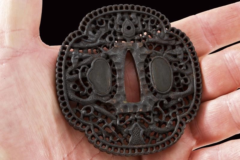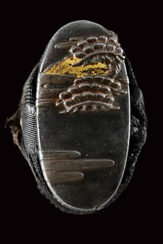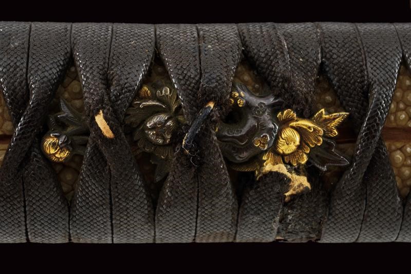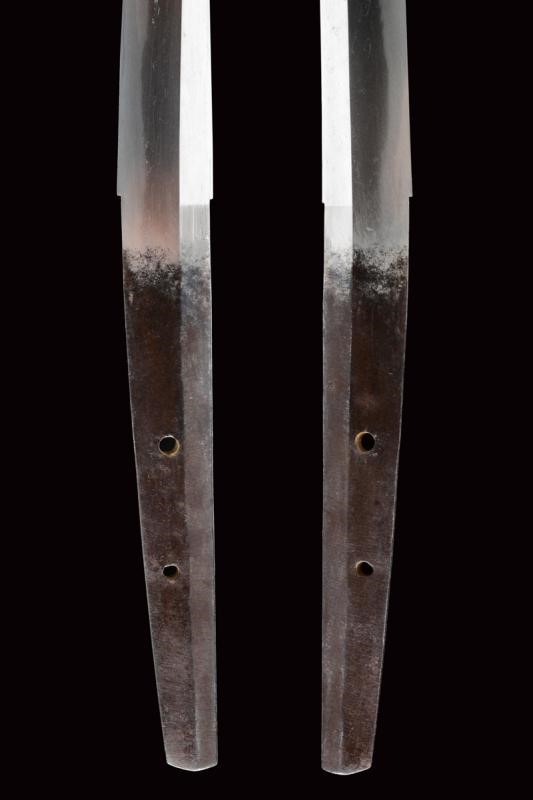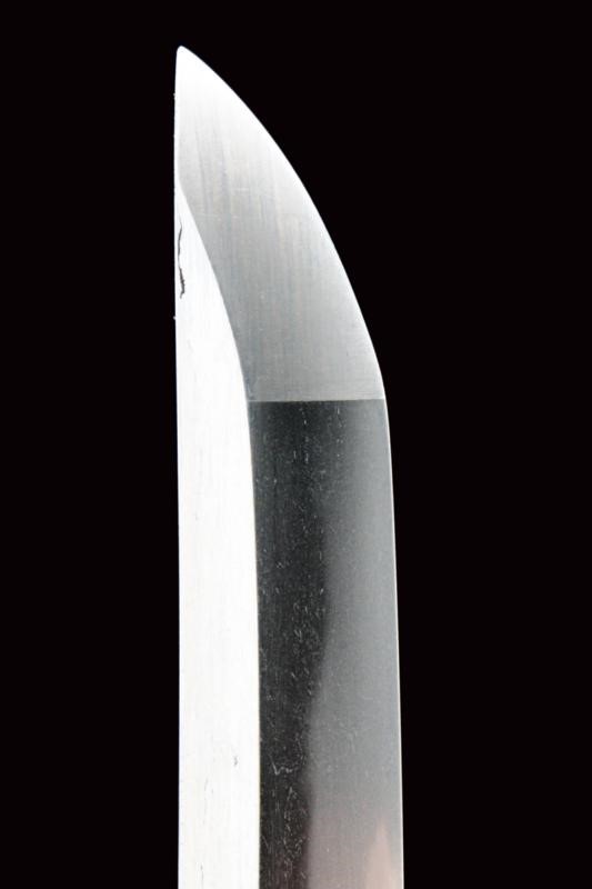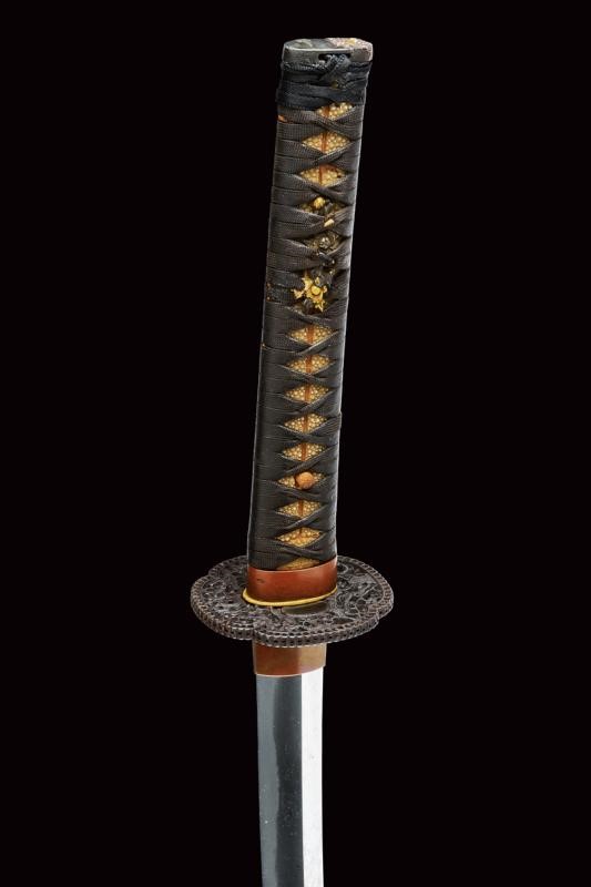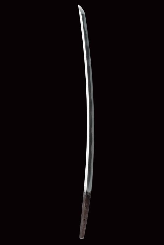Lama shinogi zukuri iori mune. Nagasa 66,2 cm. Hada: Itame nagare masame. Hamon: o-notare nioi deki ko-nie. Mumei. Periodo tardo Sue Koto - Momoyama. Kiriomi sul mune (colpo di combattimento). Ottime condizioni. In Koshirae del XIX secolo, in buon stato di conservazione. Habaki in rame. Tsuba mokko gata decorata a traforo. Fuchi liscio color rame. Kashira in shakudo con paesaggio. Menuki floreali parzialmente dorati. Tsuka ito antica. Saya in lacca rossiccia ornata a bande trasversali.