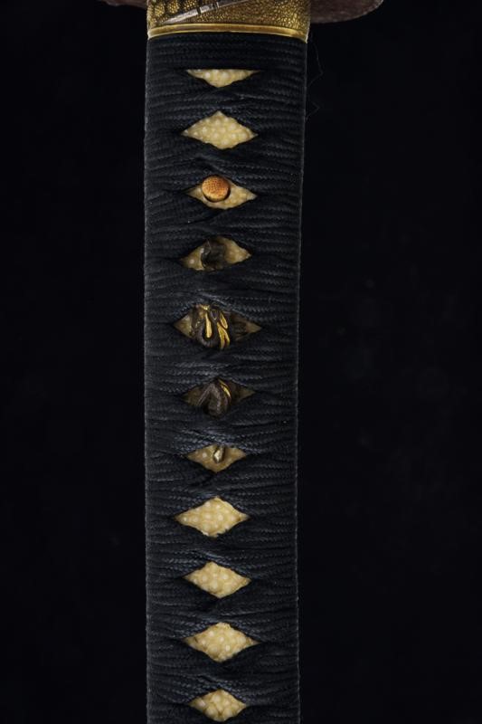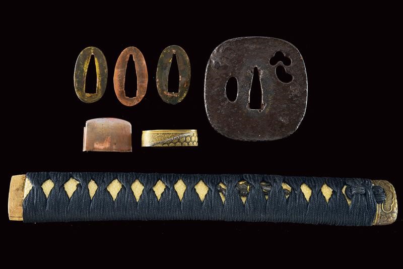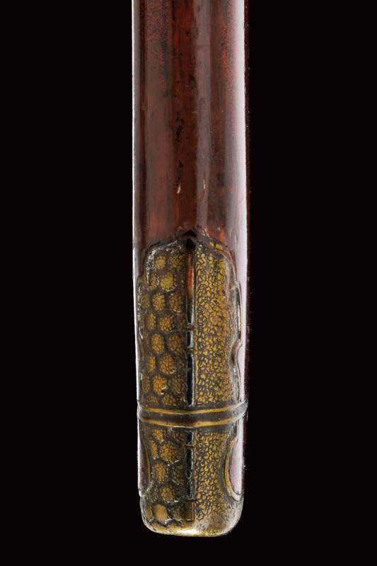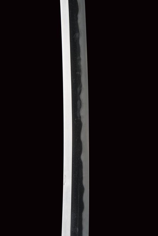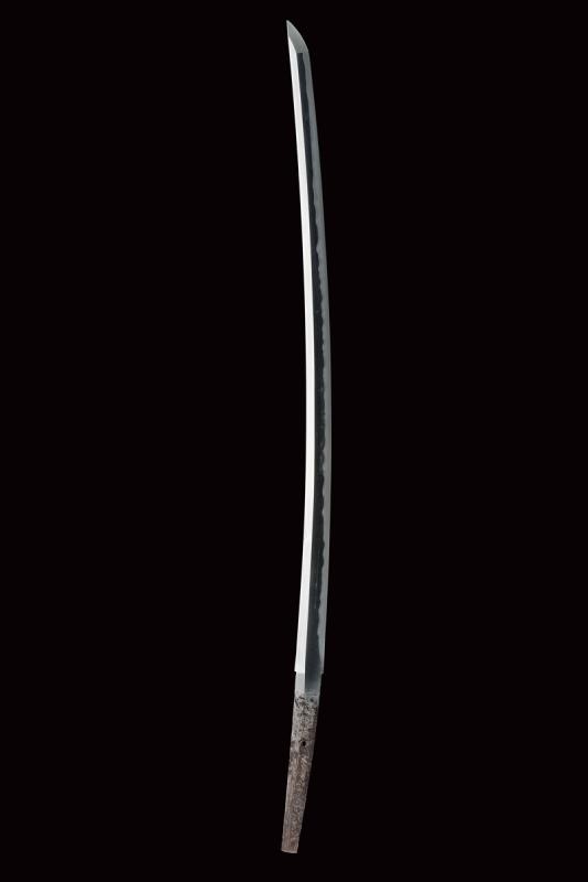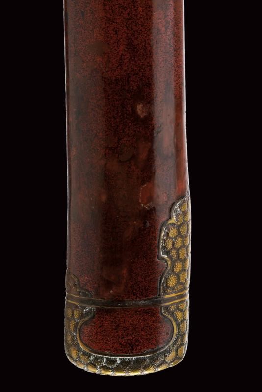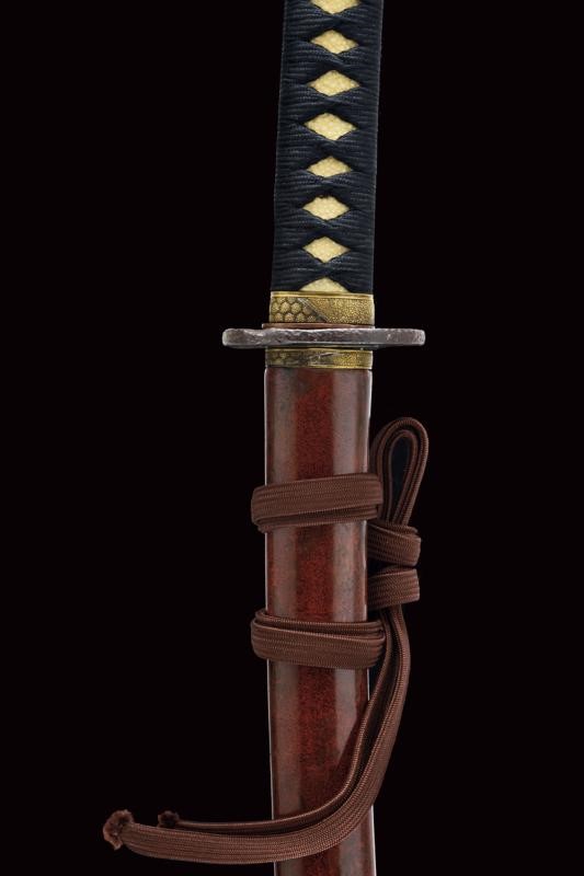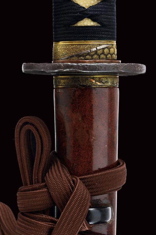 Lama shinogi zukuri iori mune. Nagasa 70,4 cm. Hada: itame nagare masame ko mokume shinogi masame. Hamon: midare gunome nioi deki ko-nie. Suriage. Epoca inizio Shinshinto (1800 circa). Scuola Tokuden. In koshirae della stessa epoca. habaki in rame. Tsuba in ferrro kaku maru gata. Fuchi e kashira in metallo color ottone ornati a esagoni granulati e con bande in argento. Menuki a draghi parzialmente dorati. Allacciatura forse pi˘ tarda. Saya in legno a lacca rossa (difetti e restauri alla finitura) con fornimenti lavorati en suite con quelli della spada. Lama in ottime condizioni con koshirae molto probabilmente coevo.