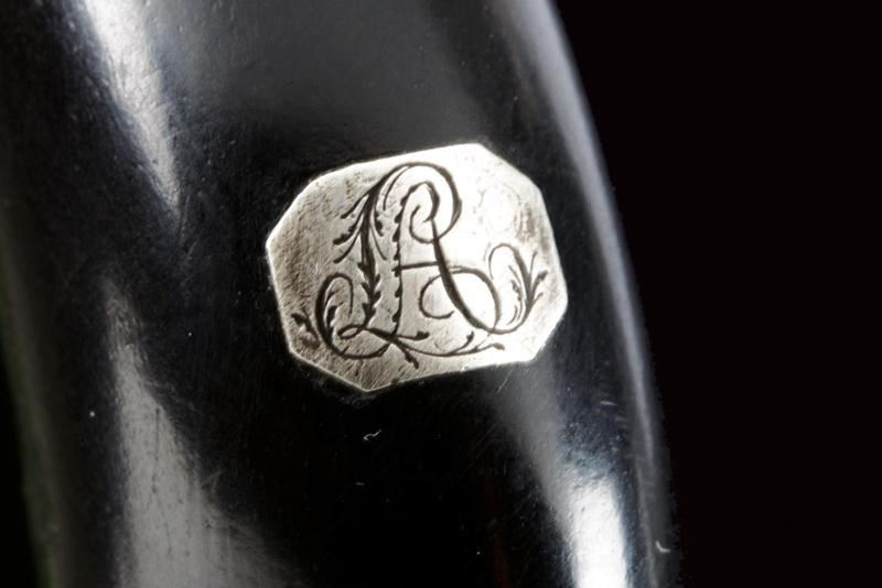Canna tonda, micro-rigata, damascata, svitabile, con mirino, cal. 11 mm. Lunga e ampia codetta incisa e munita di alzo. Castello di sezione ellittica in ferro finemente inciso sul lato sinistro; la base della canna marcata "AF" sotto corona e con numero "27". Calcio in ebano, la coccia con portacapsule dotato di coperchio a conchiglia in argento. Sul dorso uno scudetto in argento con monogramma del proprietario.