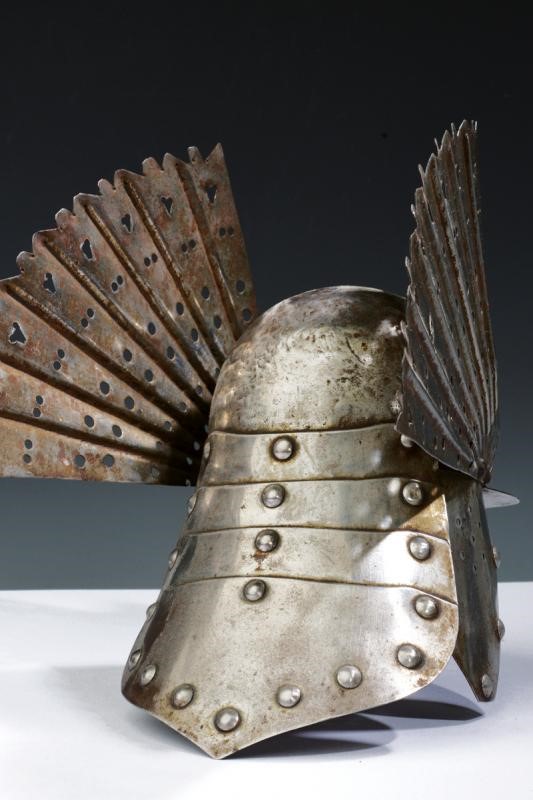 Realizzato completamente in lamina di ferro, completo di tesa, nasale, orecchioni mobili, quattro lame di gronda e ali traforate.