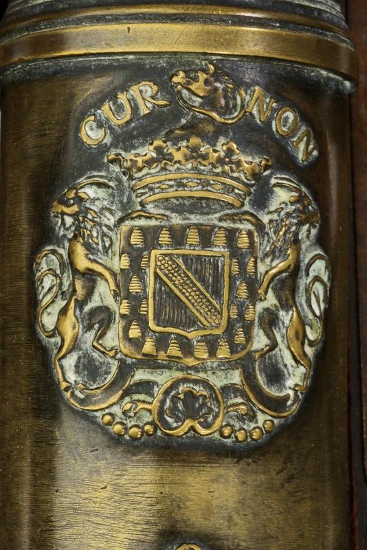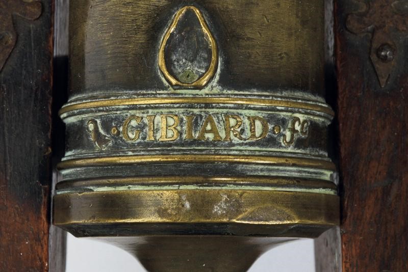 Canna troncoconica in bronzo con gioia di bocca, dotata di maniglioni lavorati a pesce, orecchioni cilindrici, al dorso emblema araldico coronato sormontato dalle lettere "CUR / NON", ben realizzato in rilievo. Il focone in una coppetta ribassata. Alla culatta l'iscrizione "GIBIARD Fc.". Affusto ligneo mobile con ruote raggiate e fornimenti in ferro.
