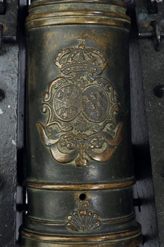 Canna troncoconica in bronzo con gioia di bocca in volata ornata con cornice a foglie d'acanto. Al dorso due cartigli lisci. Al centro un'anellatura lavorata a racemi in rilievo, orecchioni cilindrici e maniglioni lavorati a pesce. Sempre al dorso verso la culatta le armi di Elisabetta Farnese Regina Consorte di Spagna, realizzate in rilievo. Il focone con fregio a conchiglia, pomo di culatta sferoide. Su affusto ligneo di produzione pi˘ recente.