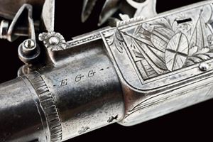 Canne tonde, lisce, brunite, incise a motivi floreali, svitabili, con punzone del banco di prova, cal. 10 mm. Castelli del tipo boxlock finemente incisi a trofei. Le culatte firmate "EGG" e "LONDON" su un lato e munite di punzoni del banco di prova. Cani dorsali, dotati di sicura. Grilletti a scomparsa. Calci in legno con dorso zigrinato e munito di scudetto in argento. Nella loro cassetta di legno rivestita internamente di panno verde, realizzata in due piani e munita di vari attrezzi e della fiaschetta. Completa di chiave. Il coperchio con monogramma intarsiato in ottone "de MT".