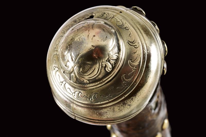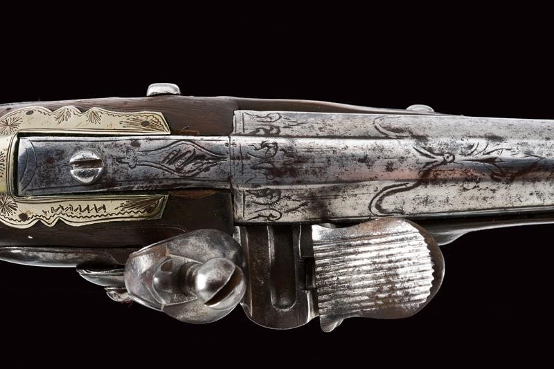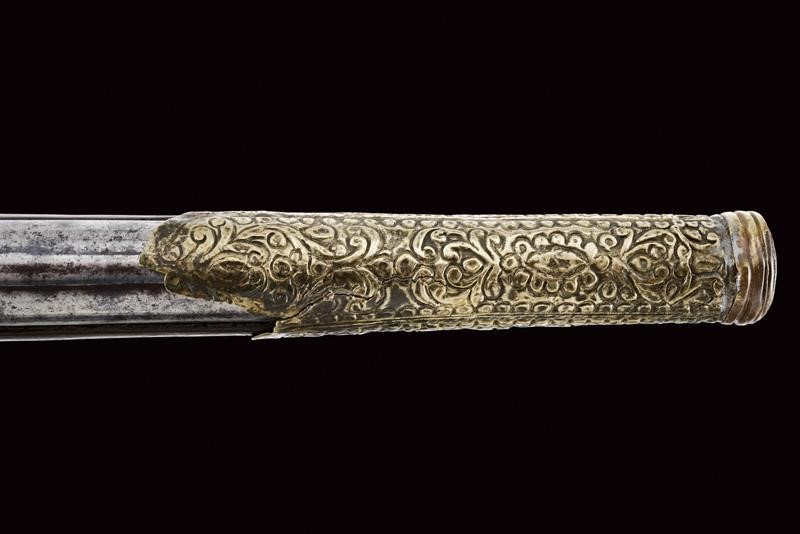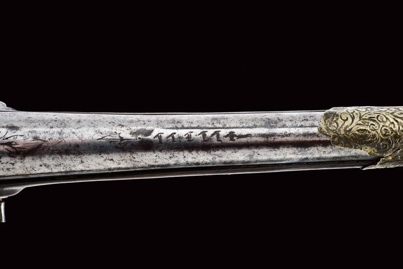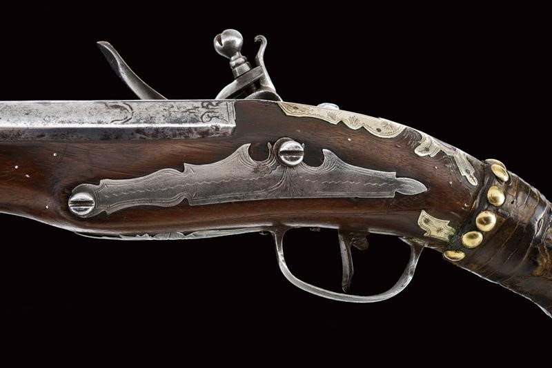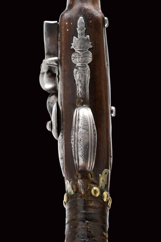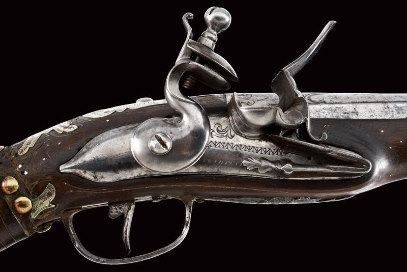 Canna liscia tonda, con base quadra e bindella, il segmento iniziale con sobrie incisioni floreali, la bindella marcata "111111"; cal. 15 mm. Codetta incisa. Batteria a pietra focaia con cartella tondeggiante ed incisa con simboli che fingono una firma. Cassa intera in legno con agemine, coccia e reggicanna in argento, parzialmente incisi. Ponticello e contropiastra in acciaio, decorati en suite. Tipica bacchetta finta. Il collo con resti di rivestimento in cuoio. Piccole mancanze e difetti.