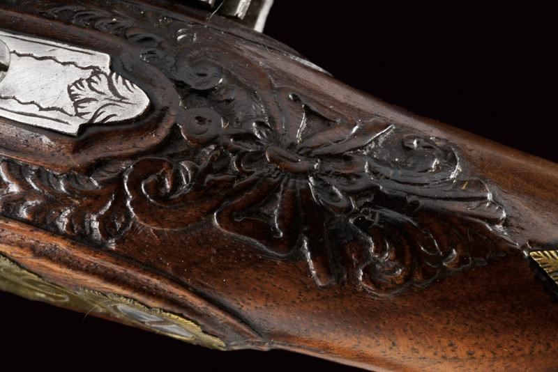 Canna liscia a due ordini, prima ottagonale, con incisioni ed agemine floreali in oro (piccole mancanze), poi tonda dopo un anellatura e con volata dotata di gioia di bocca, cal. 11 mm; codetta incisa. Batteria intagliata ed incisa a motivi floreali. Cassa intera in legno finemente scolpita a motivi floreali attorno alla codetta. Fornimenti in ottone, incisi a motivi floreali. Bacchetta in ferro con cavastracci.