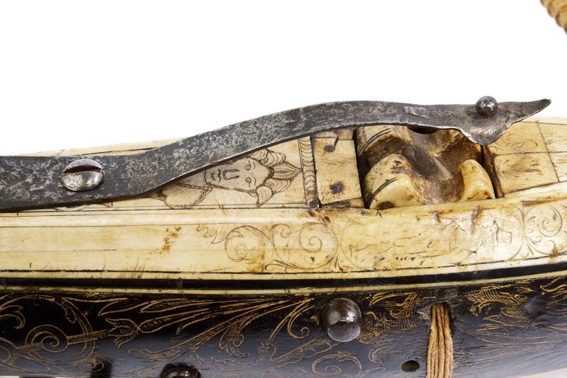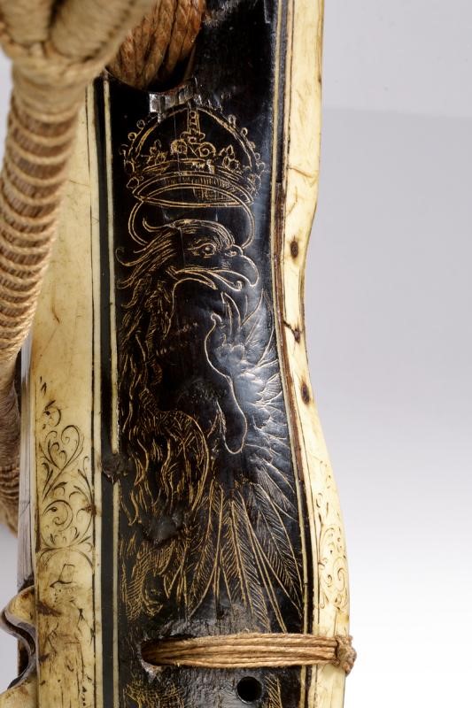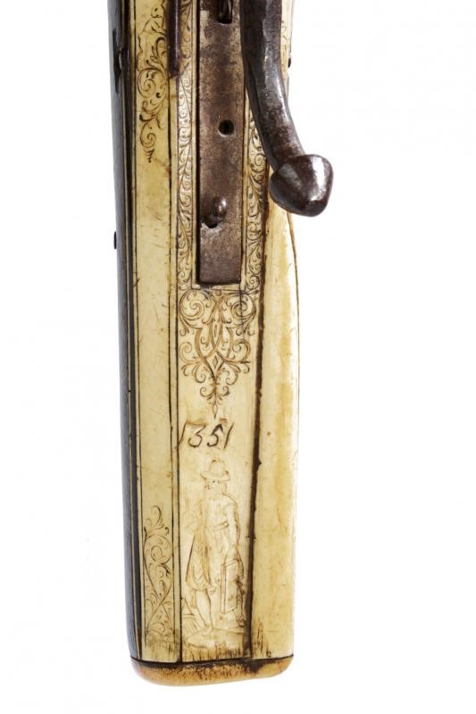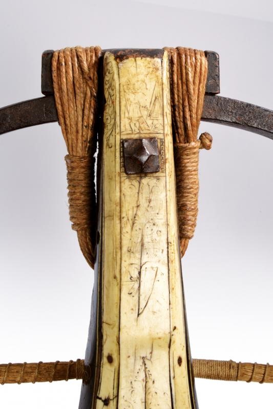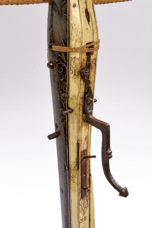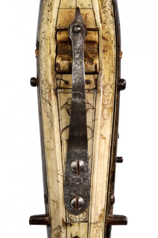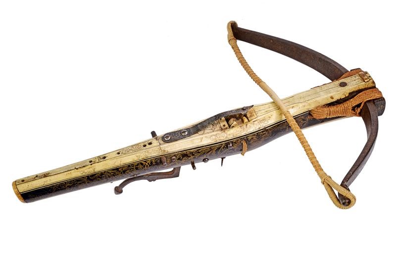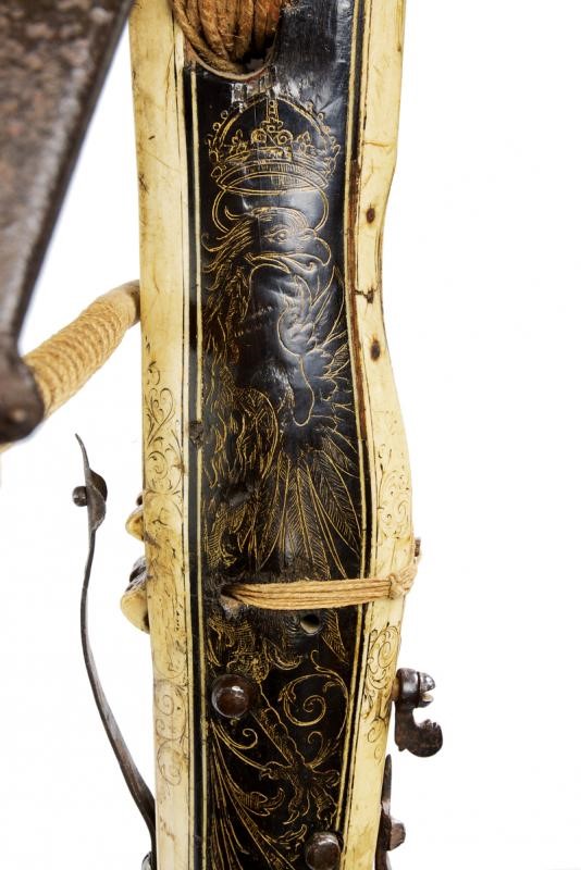Pesante arco in ferro completo di cordatura di epoca successiva. Teniere alla tedesca in ebano, finemente inciso e dorato su entrambi i lati. Recante un aquila sormontata dalla corona reale, una figura grottesca, un uccello, un segugio e disegni floreali. La parte inferiore e il dorso placcati con lastre in osso incise a motivi floreali e con personaggi, la coda marcata "1351". Il lato superiore dotato anche di cinque fori (per una diottra o un alzo). La noce in osso con copertura in ferro. Robusta manetta e grilletto in ferro. Piccoli danni e restauri.
