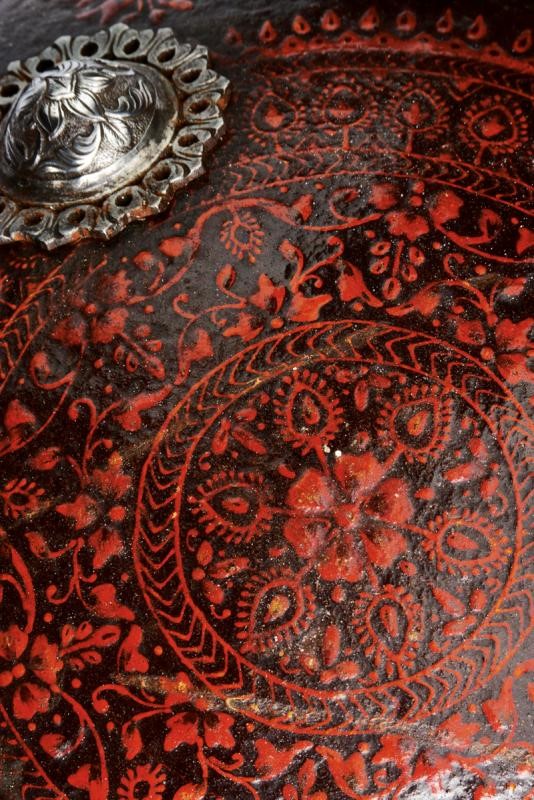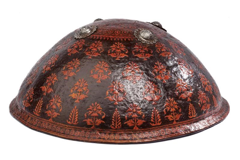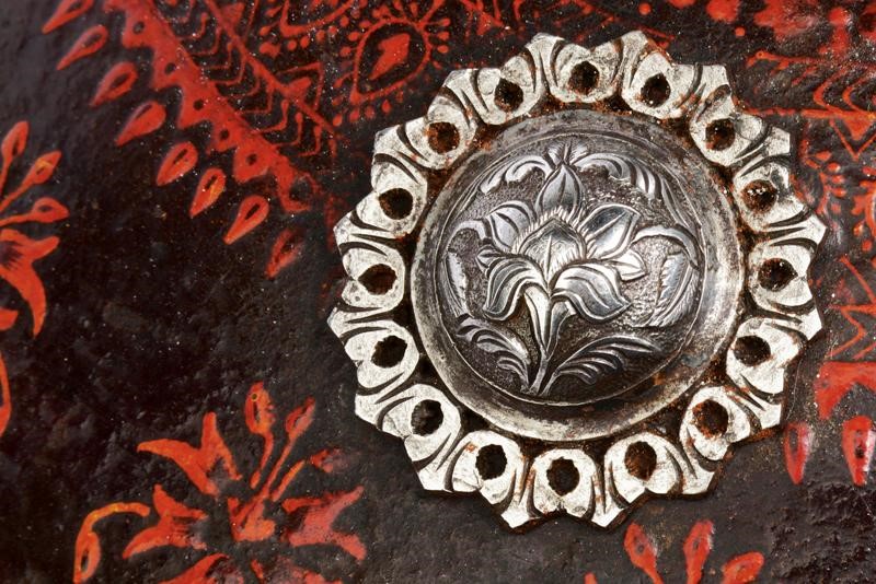 In cuoio di bufalo di forma circolare, ed estremamente convesso, con bordo leggermente volto verso l'esterno, munito di quattro borchie in argento finemente incise a motivi floreali in bassorilievo su fondo granulato e con bordo a petali traforati. Tutta la superficie finemente dipinta a mano a motivi floreali color rosso su fondo nero. All'interno decorazioni a cinque rami dipinti e quattro anelli in ferro di supporto.