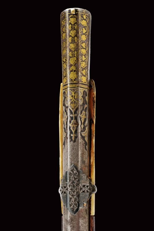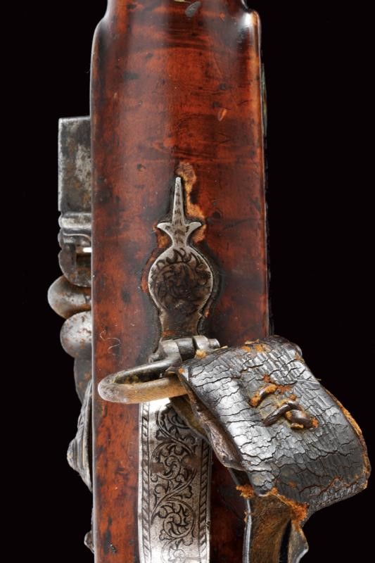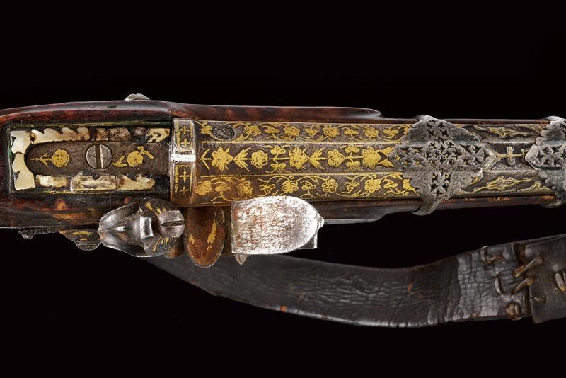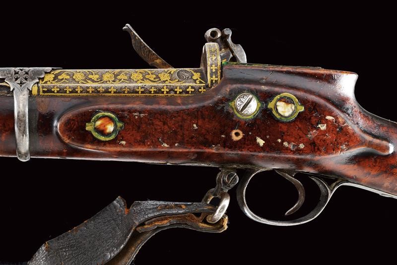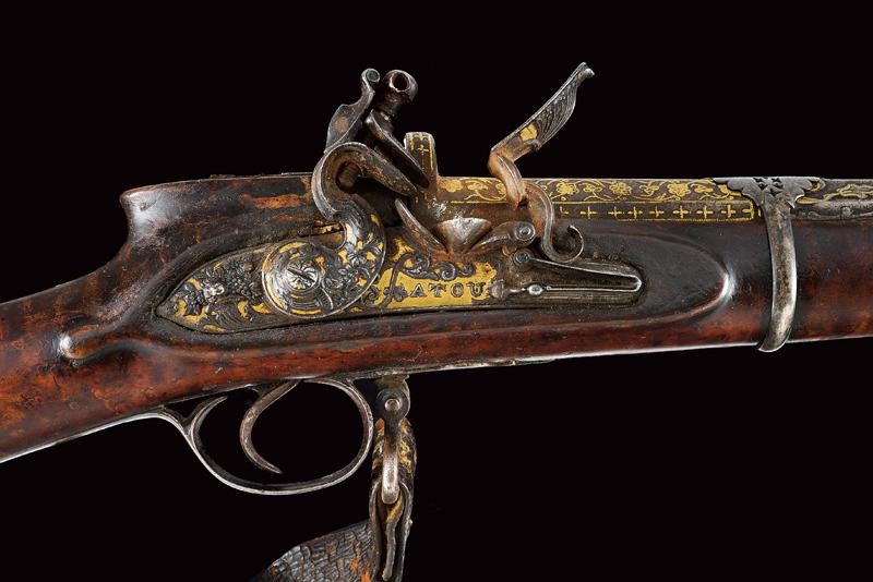 Pesante canna liscia, ottagonale, in damasco, con alzo e decorazioni floreali in oro alla base, volata leggermente strombata, decorata en suite e munita di mirino, cal. 17 mm. Codolo decorato in oro e con cornice in madreperla. Bellissima batteria a pietra focaia firmata "Fatou" riccamente intagliata e dorata a motivi floreali in rilievo e munita di sicura e sistema antifrizione e a tenuta stagna (meccanica funzionante). Cassa intera in legno, la parte terminale, sotto alla volata, in corno (mancanze), il calcio decorato con tarsie in madreperla e metallo. Ponticello in ferro inciso e niellato. La canna tenuta da sei reggicanna in argento traforato. Bacchetta in ferro con battipalla intagliato. Cinghia originale in cuoio. In patina, piccole mancanze e difetti.