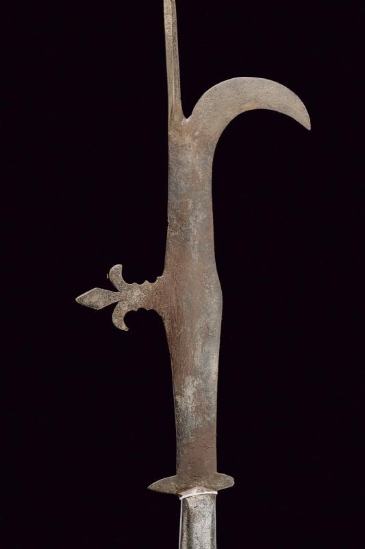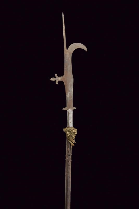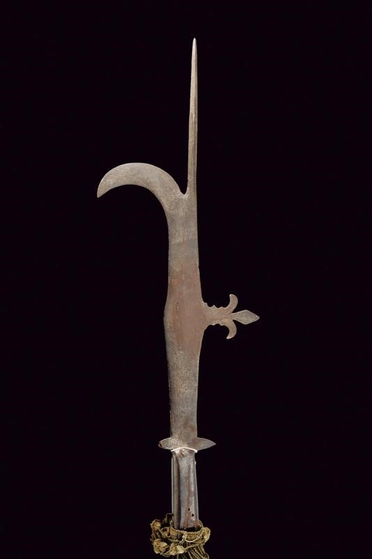 Ferro con cuspide a lama di sezione a losanga, sottile lama con ronca a doppio taglio; arresto dorsale a forma di giglio, due arresti alla base (uno leggermente accorciato); gorbia di sezione rettangolare con angoli arrotondati. Su asta antica ma non pertinente, di forma faccettata. Nappa in tessuto verde di epoca pi˘ tarda.