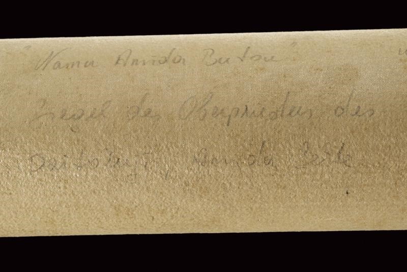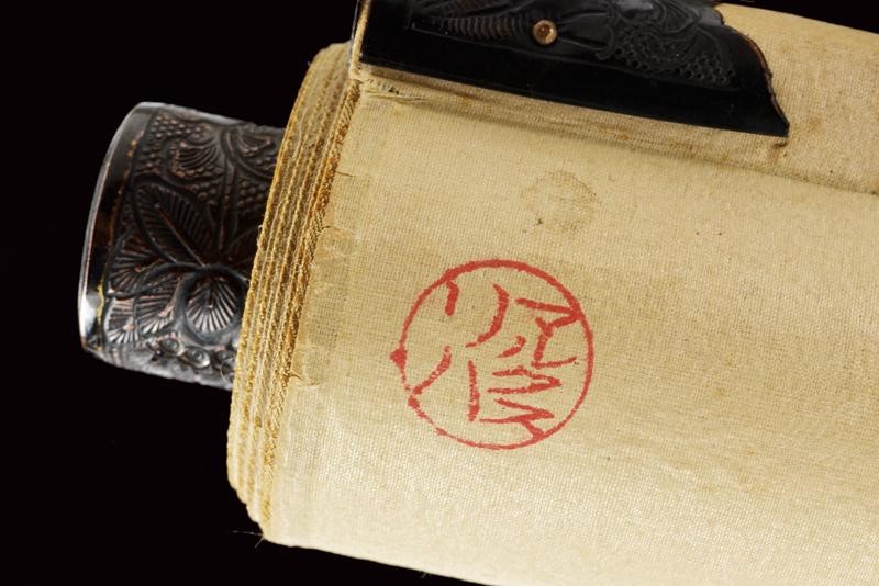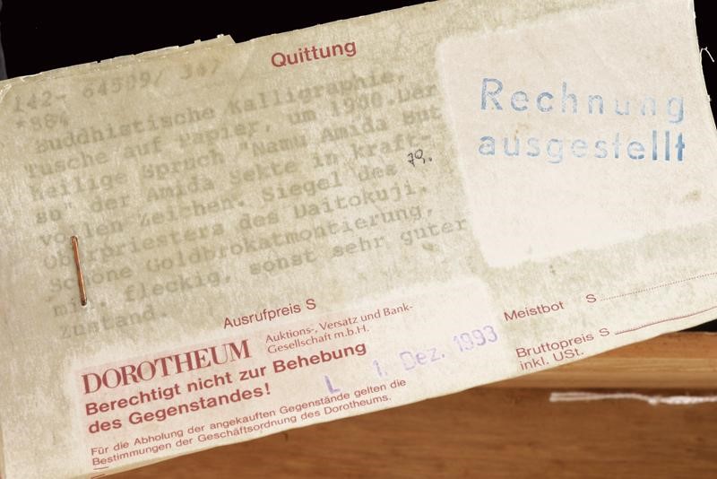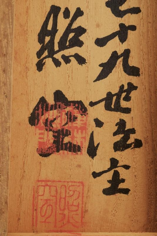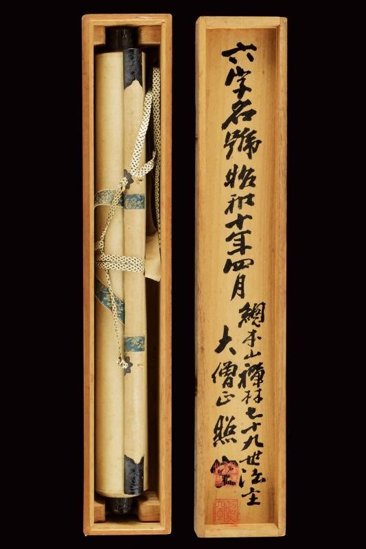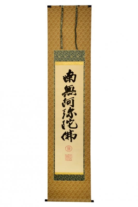 Al centro iscrizione shodo con inchiostro nero su carta bianca "Namu Amida Butsu" della setta Amida. In basso il sigillo del sacerdote del Daitokuji. Il bordo in bel broccato dorato. I due tubi sommitali in legno con bordi finemente incisi e laccati di nero. ?????? (meaning: " saluto a Amitabha Buddha"). Buddha Amitabha è luce infinita e vita eterna. Nella sua originale Kiri-box.