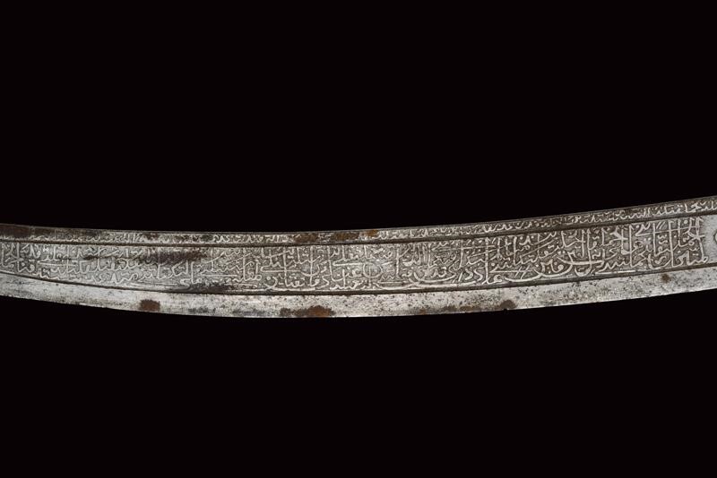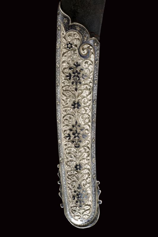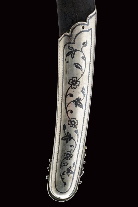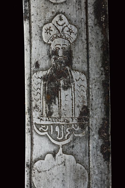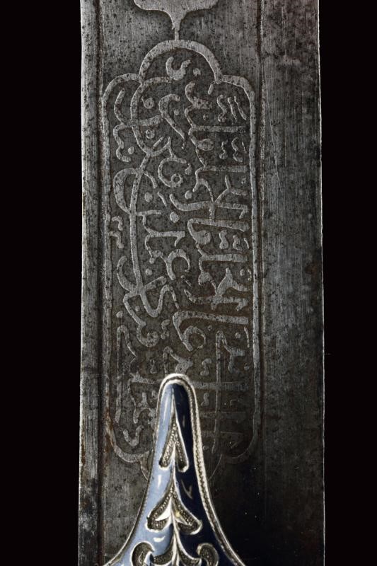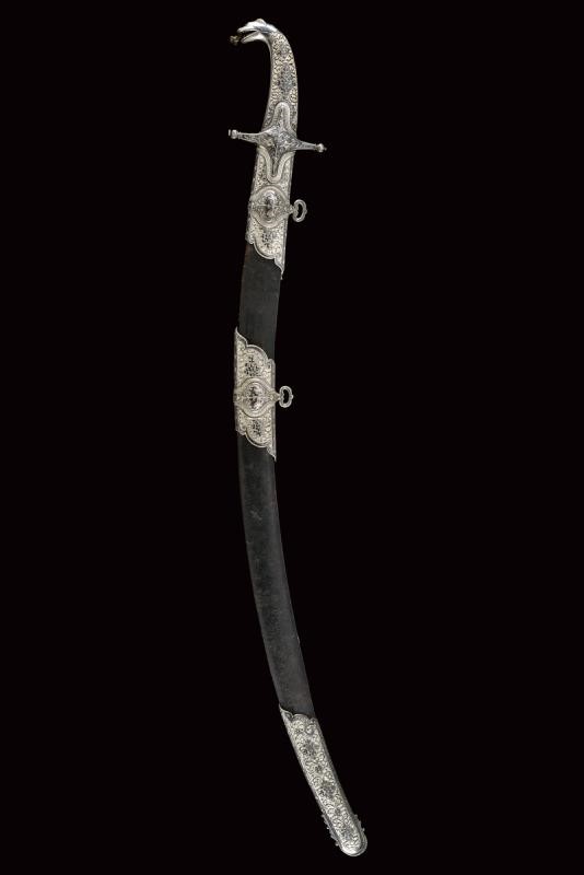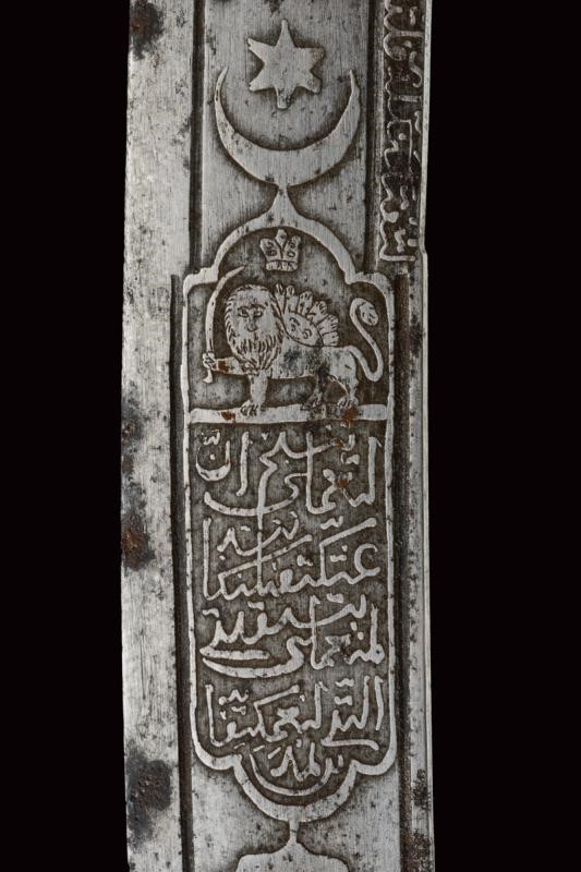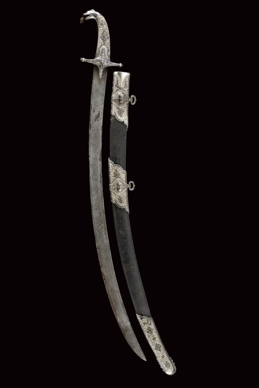 Lama in damasco, curva, a un filo, sul lato di terza cartigli incisi in lingua araba a tutta la lunghezza, alla base l'immagine di un sceicco con breve iscrizione, sopra un altro cartiglio con mezzaluna e stella; sul lato di quarta sempre cartigli con iscrizioni in arabo, alla base due grandi e profondi marchi, uno con iscrizione in arabo, sopra uno stemma persiano con sole e leone sotto corona sormontato da mezzaluna e stella. Piccole zone con danni da ruggine. Fornimento in argento riccamente decorato e parzialmente niellato a motivi floreali su sfondo granulato. Elso a croce con alette fermafodero (su un lato leggera apertura, facilmente restaurabile), bracci dritti con estremità a sfere bottonate, pomo a testa di leone, resti di catenella. Fodero in legno ricoperto di cuoio (piccole mancanze) e con tre fornimenti di lamina in argento decorati en suite. Due anelli di sospensione a fiocco. Nel cartiglio è presente un marchio di fabbrica parzialmente decifrato: 'amal-i Ö 1292' (Lavoro di ....1292) che tradotto nel calendario gregoriano risulta essere 1875-1876.