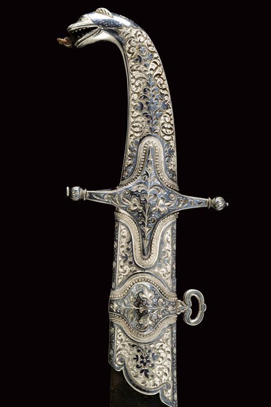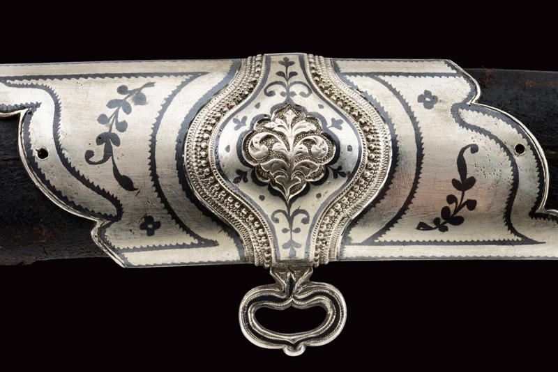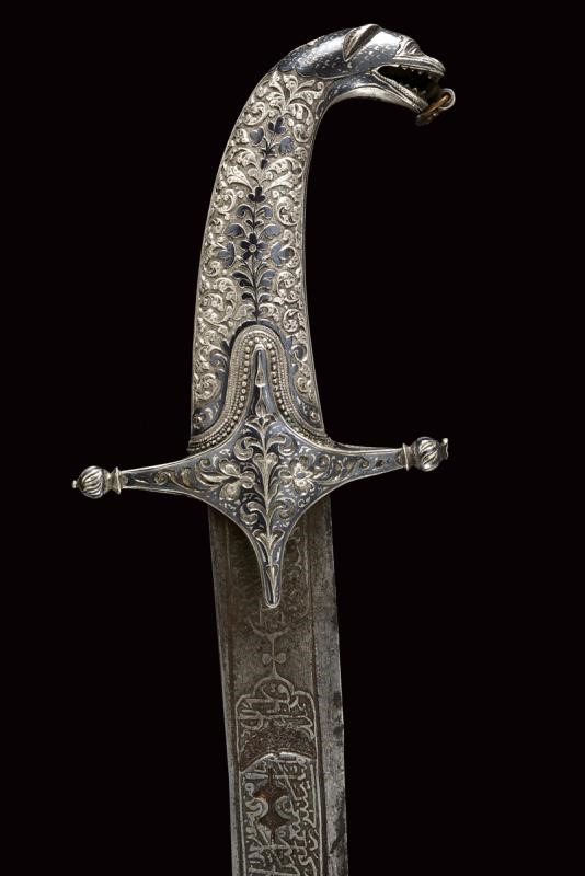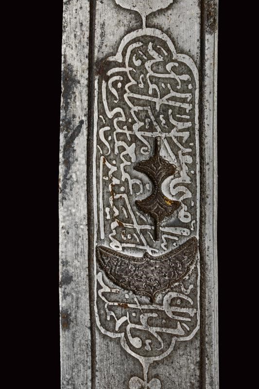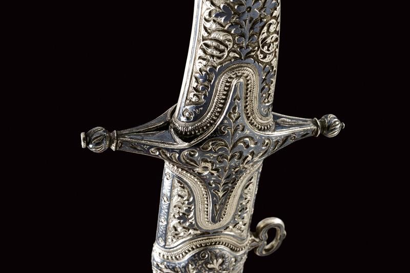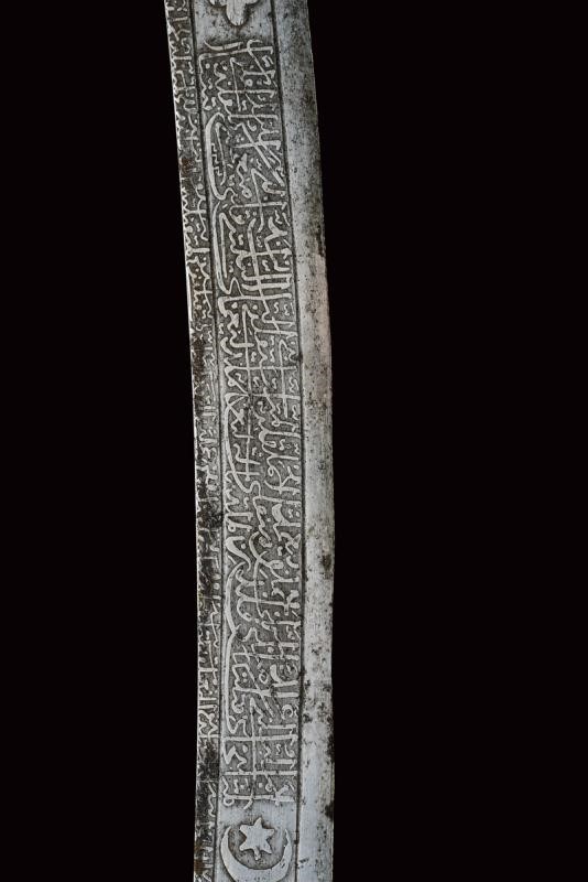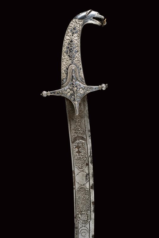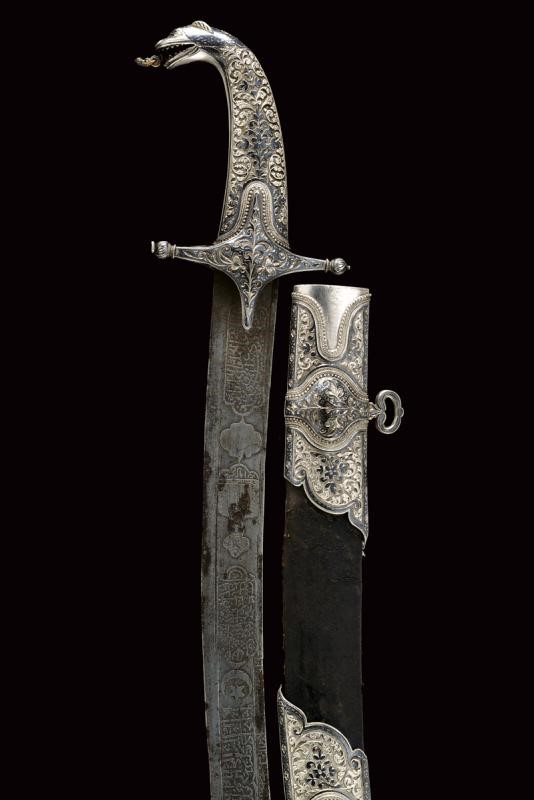 Lama in damasco, curva, a un filo, sul lato di terza cartigli incisi in lingua araba a tutta la lunghezza, alla base l'immagine di un sceicco con breve iscrizione, sopra un altro cartiglio con mezzaluna e stella; sul lato di quarta sempre cartigli con iscrizioni in arabo, alla base due grandi e profondi marchi, uno con iscrizione in arabo, sopra uno stemma persiano con sole e leone sotto corona sormontato da mezzaluna e stella. Piccole zone con danni da ruggine. Fornimento in argento riccamente decorato e parzialmente niellato a motivi floreali su sfondo granulato. Elso a croce con alette fermafodero (su un lato leggera apertura, facilmente restaurabile), bracci dritti con estremità a sfere bottonate, pomo a testa di leone, resti di catenella. Fodero in legno ricoperto di cuoio (piccole mancanze) e con tre fornimenti di lamina in argento decorati en suite. Due anelli di sospensione a fiocco. Nel cartiglio è presente un marchio di fabbrica parzialmente decifrato: 'amal-i Ö 1292' (Lavoro di ....1292) che tradotto nel calendario gregoriano risulta essere 1875-1876.