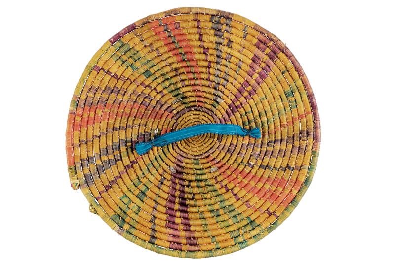 Realizzato con anelli in legno rivestiti con Rattan colorato in policromia, al centro un fornimento circolare convesso in ferro. Il manico interno di epoca successiva. Raro.