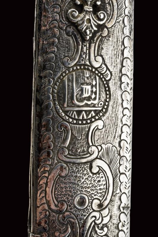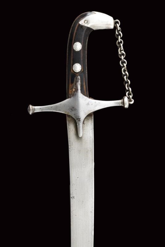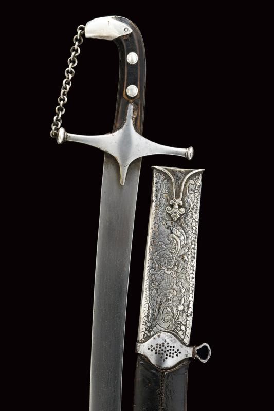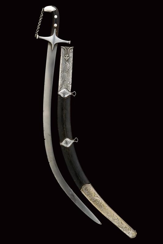 Lama a facce piane, curva, in damasco, a un filo e controfilo con alcune tacche causate dall'uso in combattimento. Fornimento con elso in ferro a croce, pomo incurvato e rivestito da un cappellotto argento munito di catenella raccordata all'elso, impugnatura con guancette in legno (piccoli difetti) dotate di rivetti in argento inciso. Bel fodero in legno rivestito di cuoio con decorazioni a rilievo. Fornimenti in argento, riccamente incisi a motivi floreali, la cappa recante anche un cartiglio con iscrizione in Arabo "ma shaía Allah" (Come/ciÚ che Dio ha voluto). Due anelli di sospensione su fascette traforate in ferro.