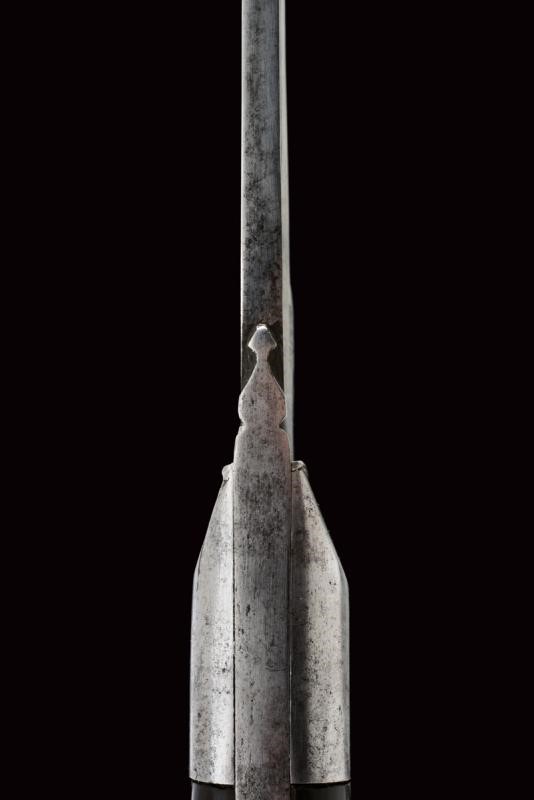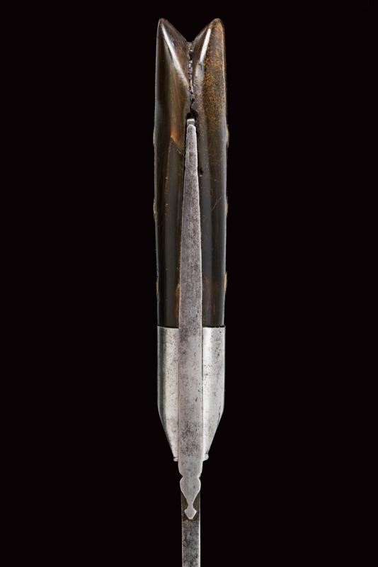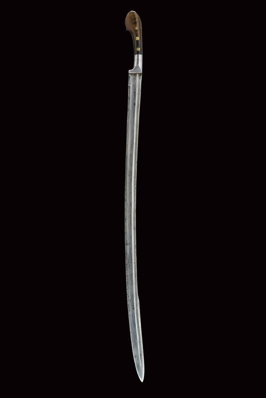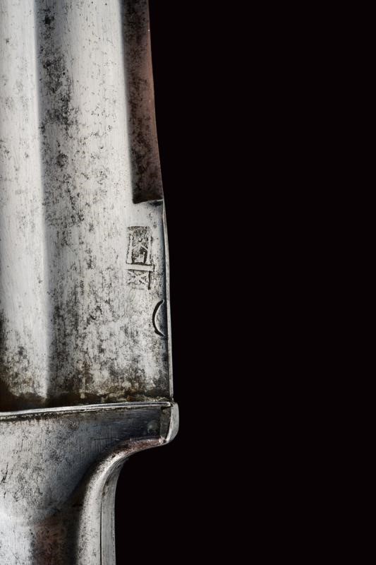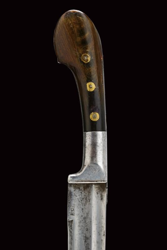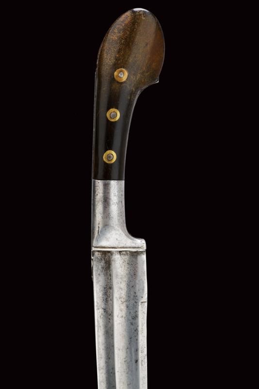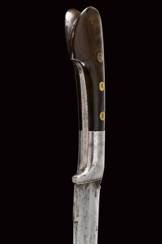 Lama leggermente curva a un filo e controfilo con duplice scanalatura, con tallone alla base e resti di una marca. Impugnatura in ferro con ghiera liscia e guancette in corno con orecchie sul tipo dello yatagan.