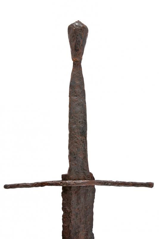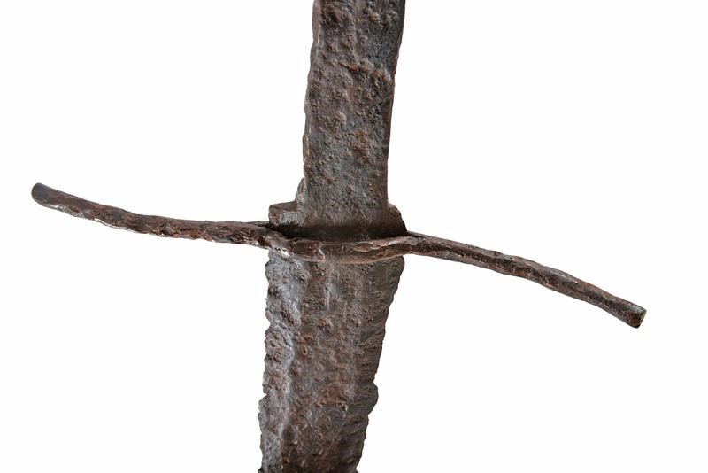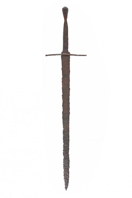 Larga lama dritta a due fili. Fornimento con impugnatura a una mano e mezza, elso a sottili bracci leggermente controcurvati, lungo pomo faccettato, crescente verso la sommità. Largo e piatto codolo.