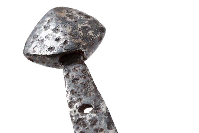 Lama dritta a due fili leggermente convergenti verso la punta, la prima parte sgusciata al centro. Elso a bracci leggermente incurvati verso la lama. Pomo piatto, appuntito, il codolo con due fori per le guancette. Rara.