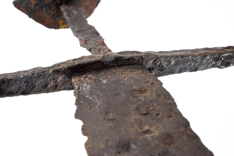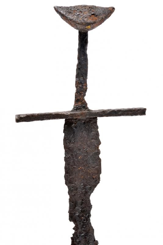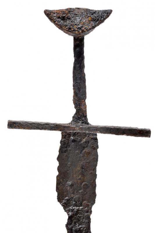 Lama dritta, piatta, a due fili; elso a bracci dritti di sezione quadra; pomo a noce di Brasile molto ben proporzionato.