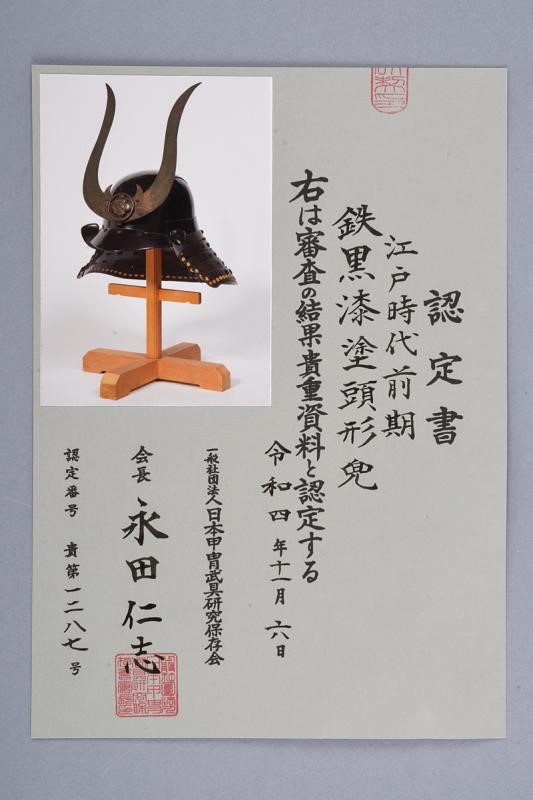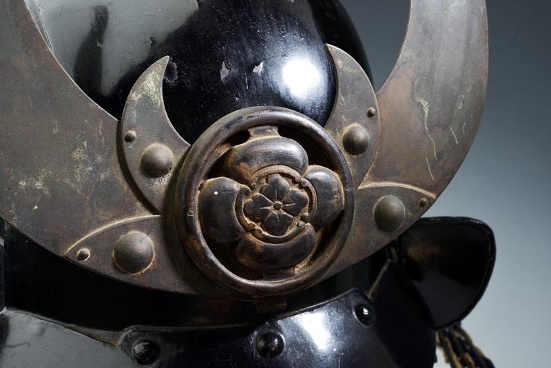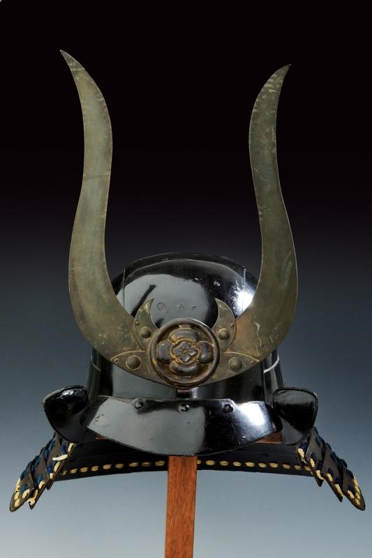 Hachi con cinque lame laccate di nero. L'Hineo Shikoro a cinque lame con lacci in inusuale Kon-ito Sugake Odoshi. L'ultima lama e le estremità con lacci in Uname. Piccoli Fukigaeshi tipici del periodo. Mabizashi laccato di rosso all'interno. Kuwagata originale in ottone con Maru-ni-Mokko mon al centro. Foderato interna in tessuto. Supporto non incluso.