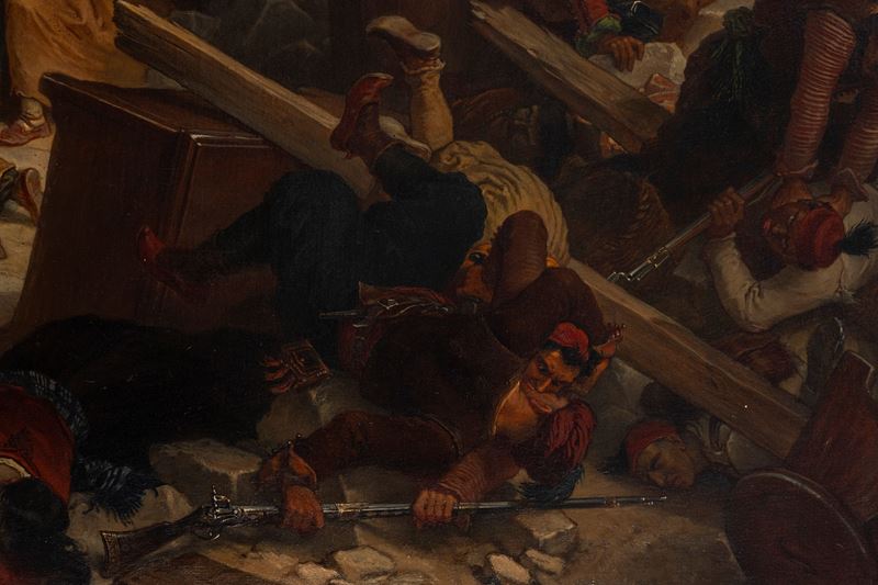 Giuseppe Lorenzo Gatteri si cimenta in questa tela di dimensioni importanti in una concitata raffigurazione di un episodio della guerra d’indipendenza greca. La composizione asimmetrica accentua il moto centripeto, animando il solido sfondo di quinte architettoniche. L’attenzione del riguardante si divide su due elementi paralleli: la croce d’oro sollevata dall’ecclesiastico a sinistra e la bandiera greca orgogliosamente sventolata da un altro prete al centro. A questo patriottismo civile e religioso si affianca quello più fieramente militaresco del combattente che, vestito dello stesso blu della bandiera, incita i rivoltosi sollevando una spada. Sul fronte opposto, le truppe turche, riconoscibili dai fez rossi e dalla bandiera con la mezzaluna, irrompono da una breccia sulla destra. Il fumo dei cannoni e dei moschetti pervade suggestivamente la scena e spiega i corpi esanimi riversi a terra in primo piano: siamo nel secondo momento di un assalto iniziato con un bombardamento che ha già impietosamente mietuto vittime civili. Lo spettatore è così trascinato nel mezzo dell’azione, nel presagio della sua sanguinosa conclusione.