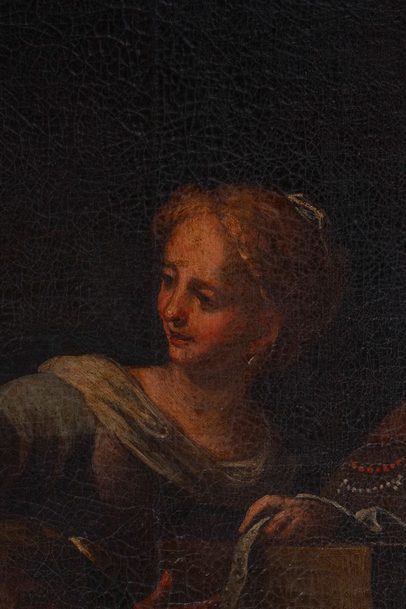 Natura morta con statua, armi e strumenti musicali in un interno con letto a baldacchino