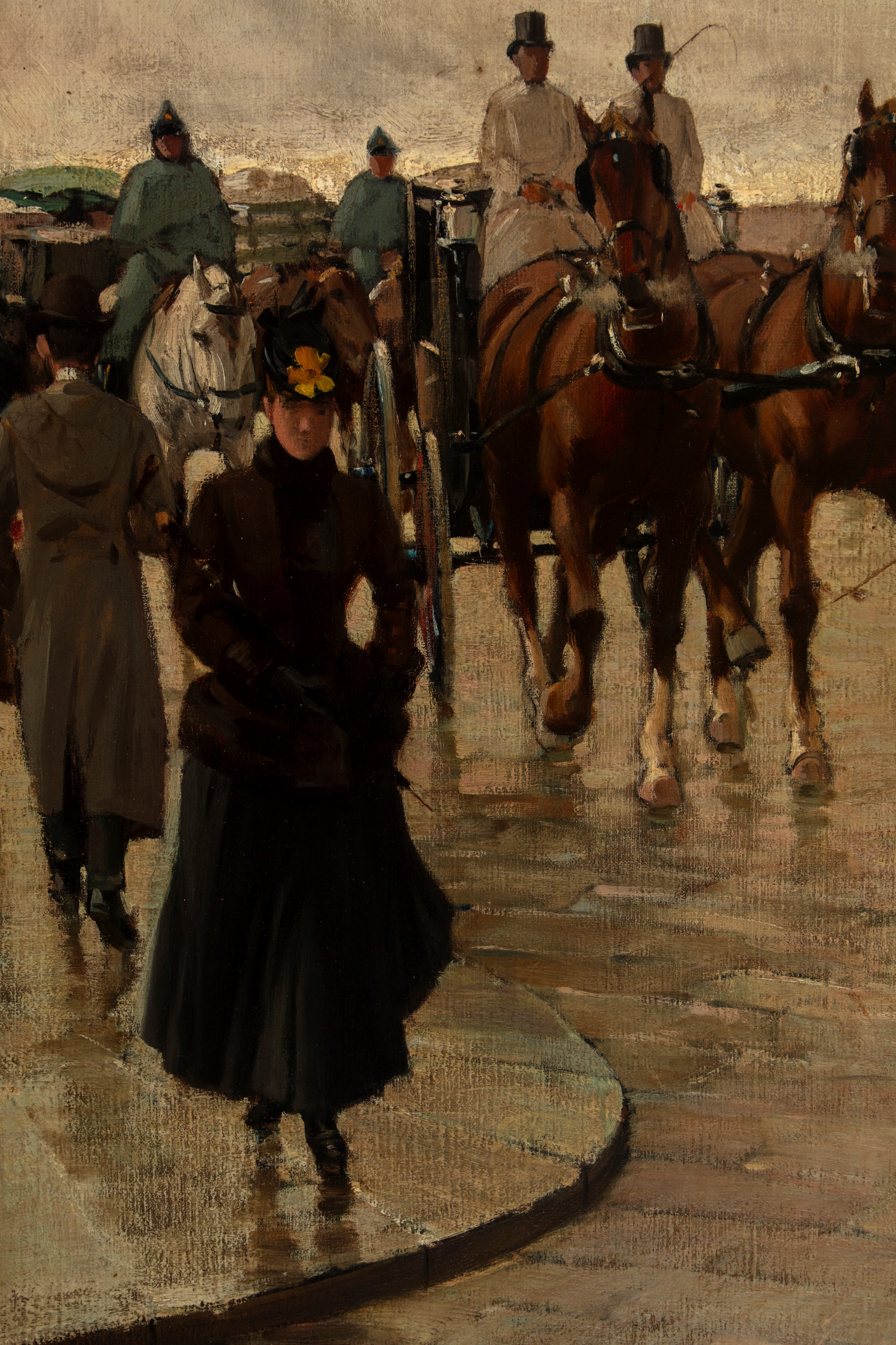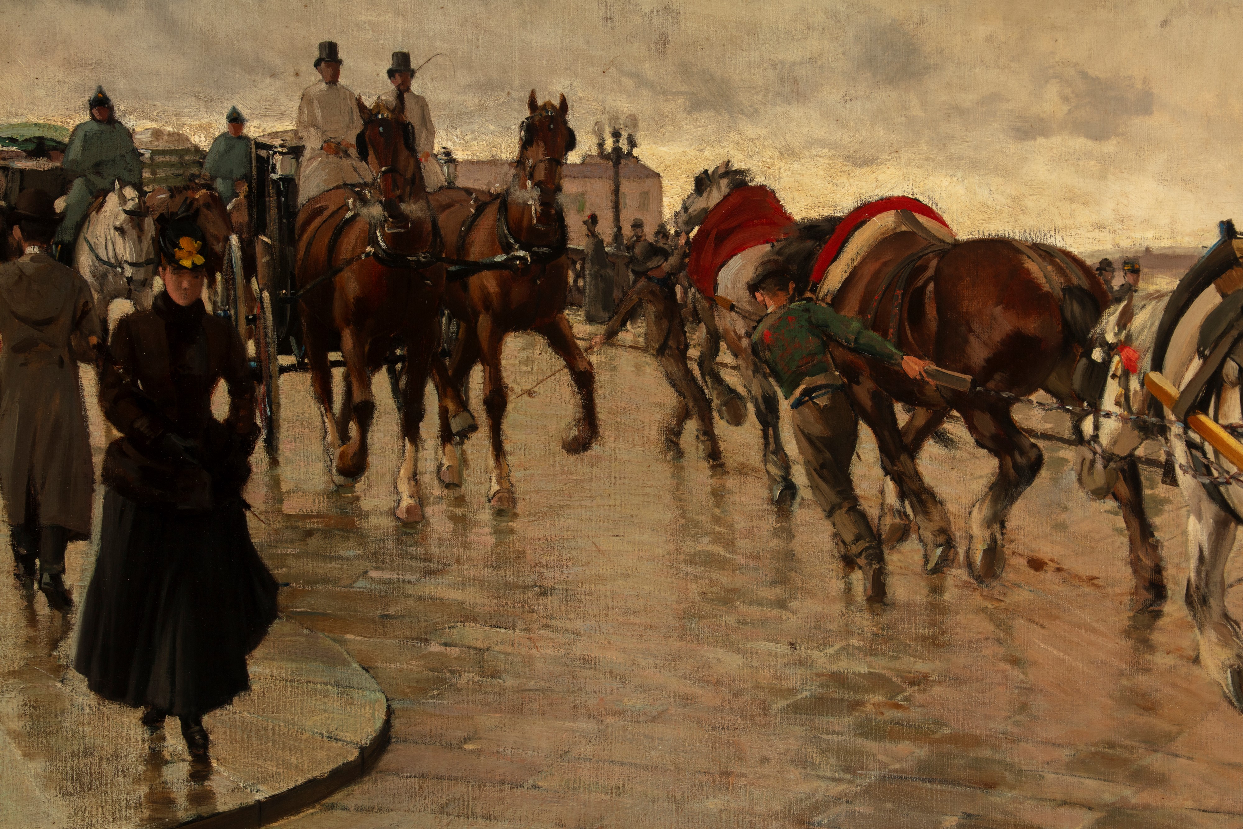 Considerato dalla critica il capolavoro di Luigi Gioli, il primo a parlarne con toni entusiastici fu Luigi Chirtani, che lo vide per la prima volta esposto a Venezia nel 1887, anno della sua realizzazione, e quindi a Bologna nello stesso periodo. Il severo critico riportò una recensione talmente mimetica da essere a sua volta immortalata nelle pagine del celebre repertorio De Gubernatis: "Il Gioli guadagna ancora nell'opinione già elevata che si ha del suo talento con un Ponte alla Carraia, sul quale si incontrano equipaggi signorili, carri plebei, dame e popolino in un giorno di pioggia. Anche per chi ricorda i quadri analoghi di De Nittis, questo del Gioli si regge e si tiene alto per pregi di forza nella finezza e resta il miglior dipinto da lui mandato a questa Mostra". L'accostamento a De Nittis, più che alla tradizione macchiaiola, non è una mera suggestione; Firenze viene, infatti, raccontata alla stregua di una Parigi moderna, con passanti che incombono sulla scena descritti con uno stile incredibilmente già novecentesco, che contrasta la precisione con la quale Gioli indugia sui cavalli. Non dobbiamo dimenticare anche l'influenza esercitata dal fratello Francesco, il quale si allontana proprio in questi anni, dal naturalismo di tradizione toscana verso una pennellata impressionista che proietta i Gioli verso una palcoscenico internazionale.