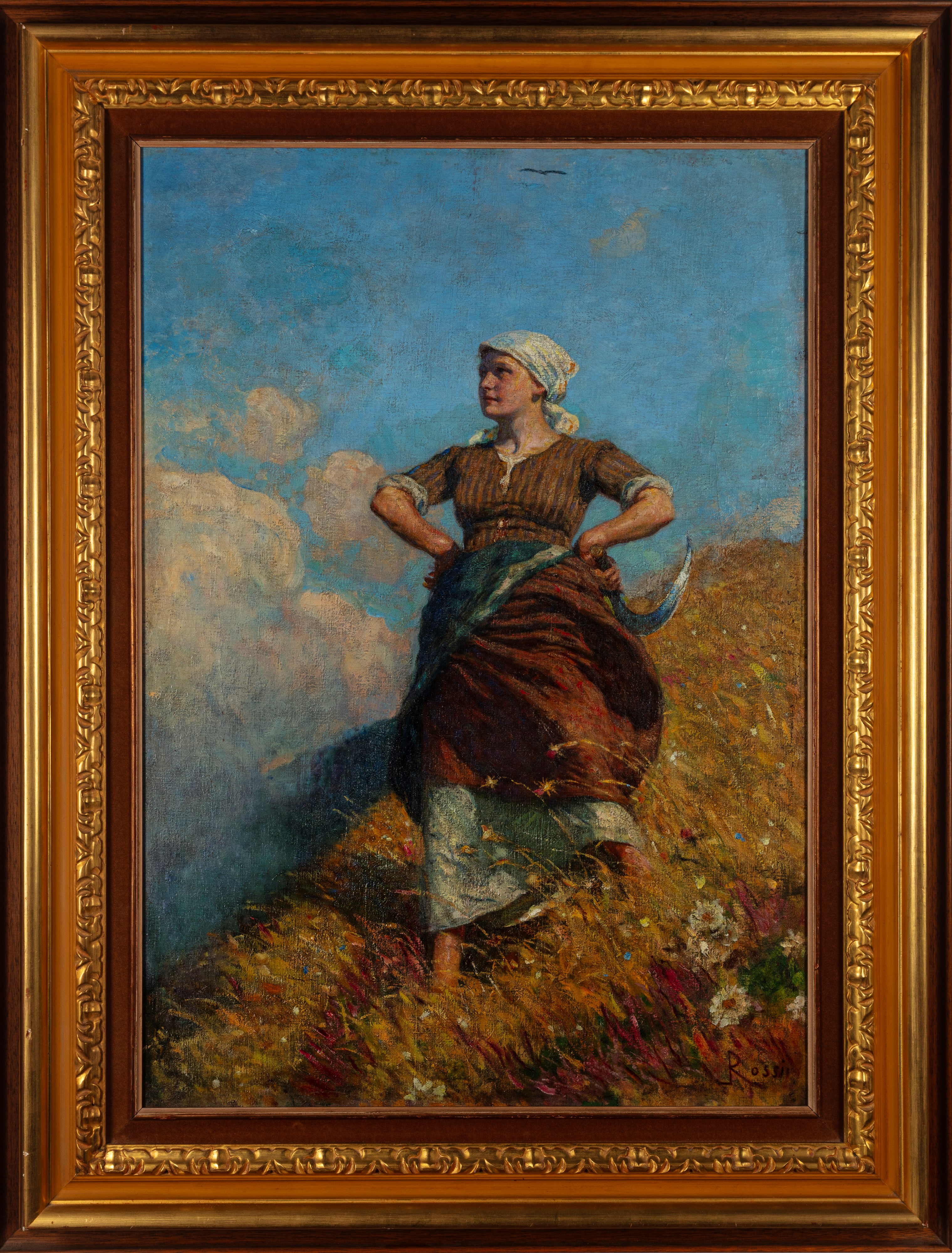 Esposto alla Promotrice di Torino nel 1910, l'Alpigiana è un dipinto di primo piano nella produzione di Luigi Rossi, che non si vedeva dal vivo esattamente da quell'evento espositivo. La tela si presenta carica di materia e con particolare attenzione al dato naturalistico, specie in alcuni dettagli, come la vegetazione alpina in basso a destra o l'aquila in lontananza all'estremità del cielo in alto al centro. Il piglio della donna che scende con tanto di falcetto la collina soffermandosi quasi in un istante di meditazione, la imparenta alle riflessive contadinotte di Millet.