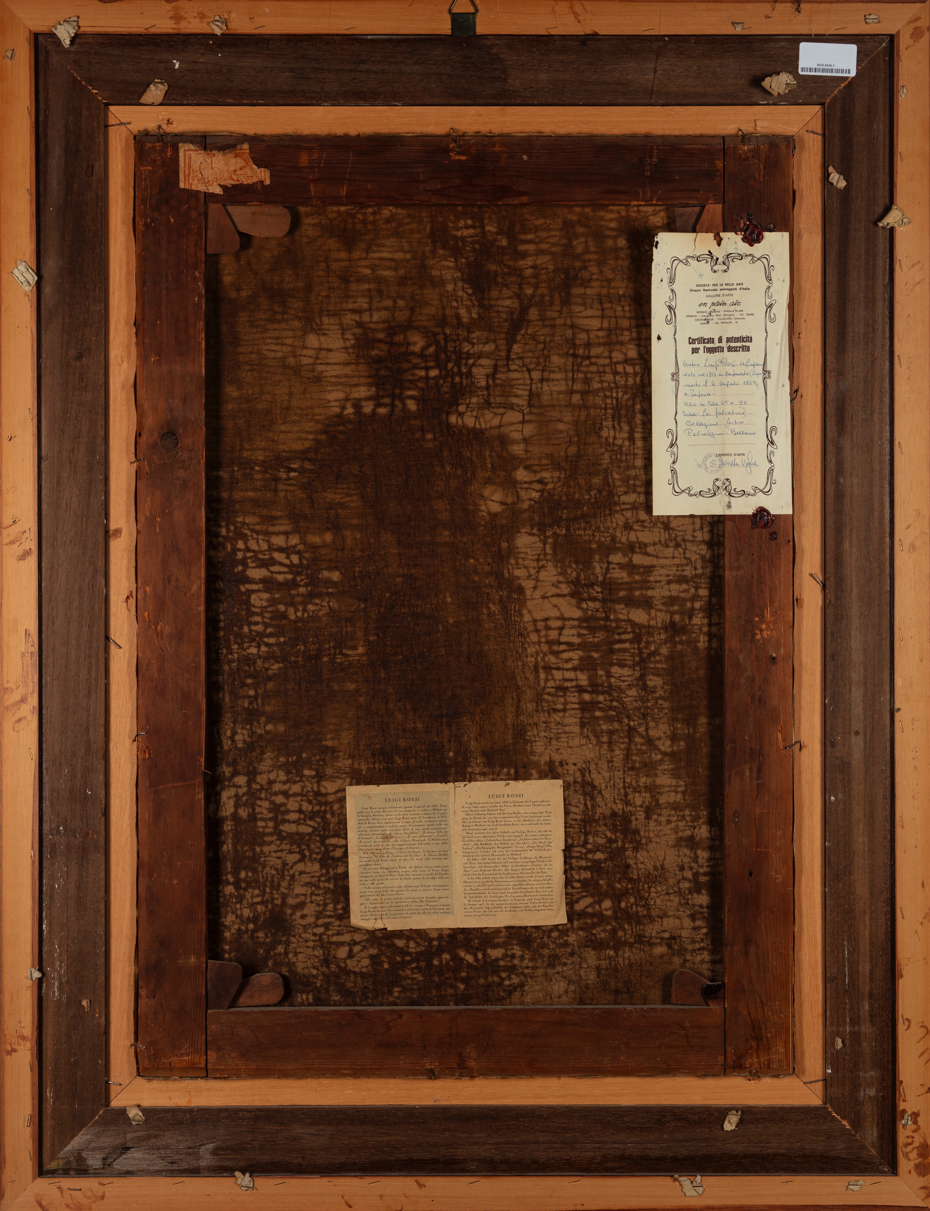 al retro, sul telaio, etichetta della Galleria Pesaro e certificato di autenticità della Società per le Belle Arti